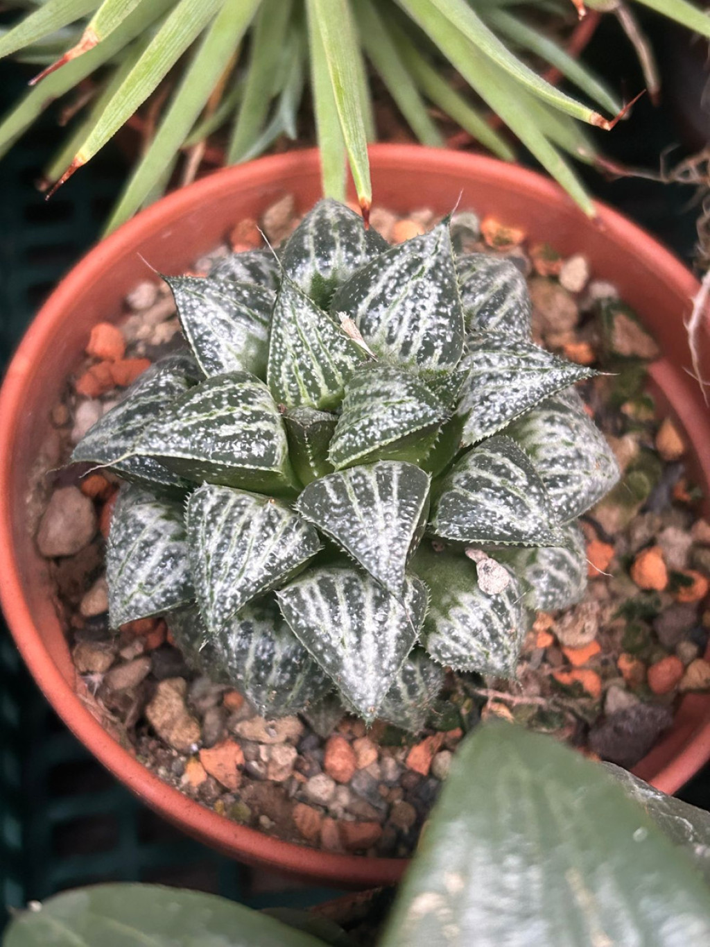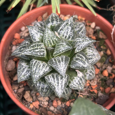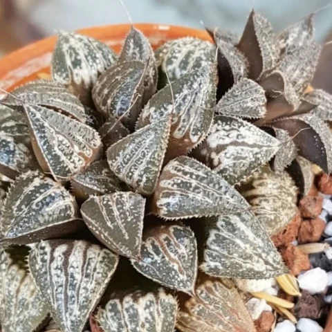 Haworthia ‘Snow Scene’, Botanik olarak tek bir doğal türü ifade etmekten çok, seçilmiş veya melezlenmiş bir kültivar grubunu temsil eder. Ebeveynleri bilinmemektedir. Bu bitkiyi özel yapan temel unsur, yaprak yüzeyine serpilmiş kar kristalleri gibi görünen yoğun beyaz beneklenme, kabarcıklı doku ve çizgisel desenlerdir. “Snow Scene” adı da tam olarak bu görsel etkiden gelir. Koyu zemin üzerinde beyaz detaylar taşıyan yaprakları sayesinde, küçük boyutlu olmasına rağmen bulunduğu ortamda hemen dikkat çeker. Özellikle koleksiyon raflarında, masa üstü düzenlemelerinde ve minyatür sukulent kompozisyonlarında çok güçlü bir estetik değer sunar.