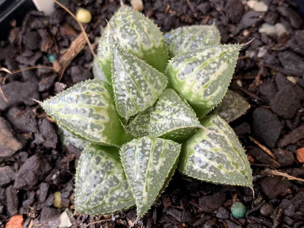 Bu kültivarın gelişim formu kompakt rozet şeklindedir. Yapraklar merkezden dışarı doğru simetrik biçimde dizilir ve sağlıklı bireylerde oldukça sıkı bir yapı oluşturur. Yaprak formu üçgensi ile mızraksı arasında değişebilir. Uç kısımlar sivridir ancak sert ve batıcı değildir. En önemli detay ise yaprak epidermisinde görülen beyaz kabartılı noktalar, çizgiler ve pütürlü dokudur. Bu doku bitkinin yüzeyine mat ve kristalimsi bir görünüm kazandırır. Bazı bireylerde beyazlık daha yoğun olurken bazı bireylerde koyu yeşil zemin baskın kalabilir. Bu da her bitkinin birbirinden farklı görünmesini sağlar. Koleksiyoncular açısından aynı isimde iki bitkinin bile farklı karakter göstermesi önemli bir avantajdır.