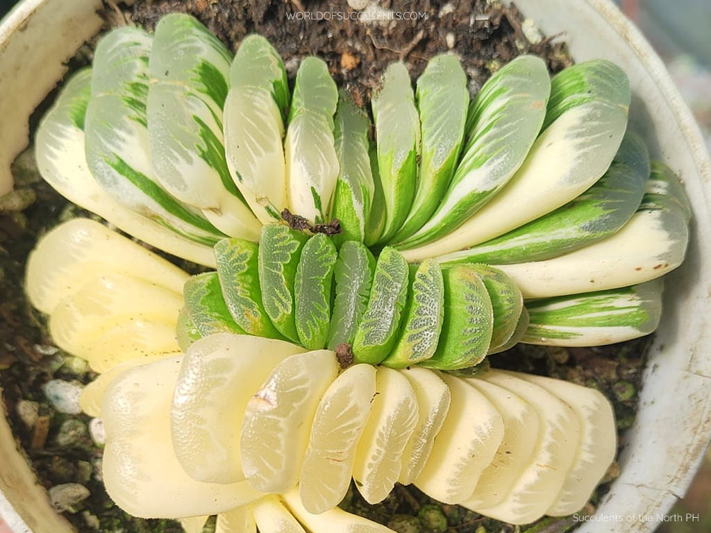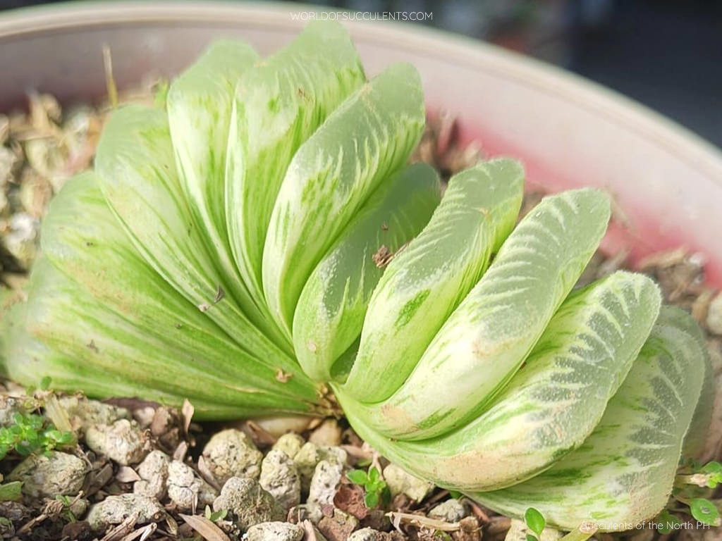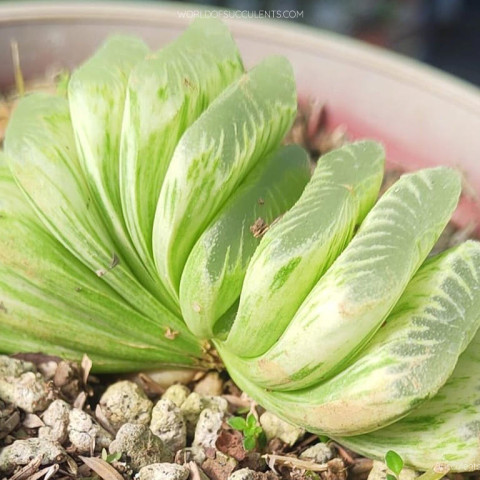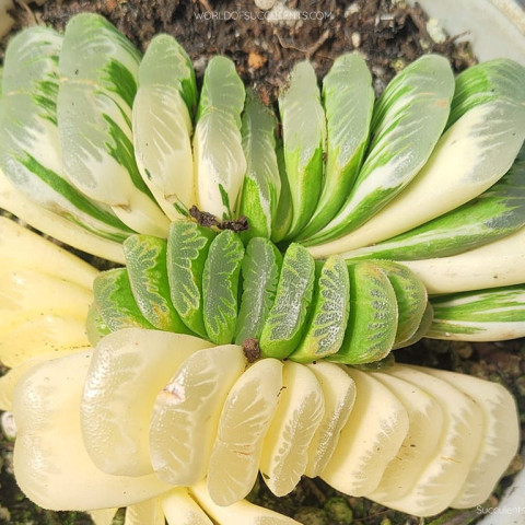 Haworthia truncata 'Lime Green Variegated', kesik uçlu kalın yaprakları, yarı saydam pencere dokusu ve lime yeşili, krem, sarımsı beyaz ile koyu yeşil tonların birlikte görüldüğü alacalı yapısıyla dikkat çeken özel bir Haworthia truncata kültivarıdır. Klasik Haworthia truncata 'Lime Green' formunda olduğu gibi yapraklar sıra halinde dizilir ve üst kısımları düz kesilmiş gibi görünür. Bu düz uçlarda bulunan pencere dokusu, bitkinin en ayırt edici bölümlerinden biridir. Alacalı formda bu alanlar daha açık, daha parlak ve daha değişken renk geçişlerine sahip olabilir. Açık renkli dokularda klorofil oranı daha düşük olduğundan gelişim standart yeşil formlara göre daha yavaş ilerleyebilir. Sağlıklı bireylerde yapraklar dolgun, sert, sıkı ve düzenli sıralıdır. Yapraklarda yumuşama, tabandan kararma, kahverengi yanık lekeleri veya pencere yüzeylerinde çökme görülmesi bakım koşullarının kontrol edilmesini gerektirir.