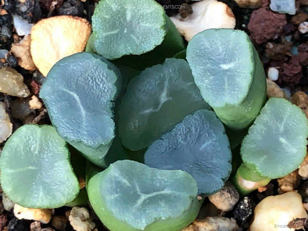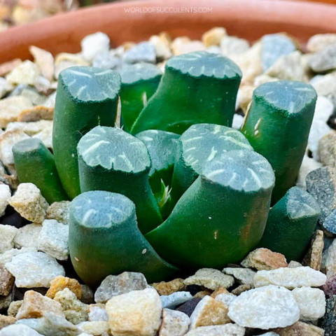 Haworthia truncata var. maughanii, üst kısmı düz kesilmiş gibi görünen silindirik yaprakları, belirgin pencere dokusu ve bu pencere alanlarında oluşan açık renkli yıldız-damar desenleriyle tanınan çok özel bir Haworthia truncata formudur. Güncel sınıflandırmalarda Haworthia maughanii adıyla ayrı tür olarak da ele alınabilir; yetiştiricilikte ise Haworthia truncata var. maughanii ismi hâlâ yaygın şekilde kullanılır. Klasik Haworthia truncata’dan farklı olarak yapraklar çoğu zaman daha yuvarlak, daha kısa-silindirik ve üstten bakıldığında küçük sütunlar gibi görünür. Her yaprağın üst yüzeyinde ışığı geçiren düz pencere alanı bulunur. Bu pencere yüzeylerinde beyazımsı, gri, krem veya açık yeşil damar desenleri oluşabilir. Bitki yavaş gelişir, kompakt kalır ve bakımda temel hedef yaprakların dolgun, pencere dokusunun sağlıklı ve kök sisteminin güçlü tutulmasıdır.