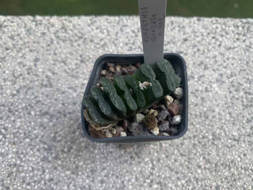 Haworthia truncata var. minor uygun bakım koşullarında çiçek açabilir. Çiçek sapı yaprakların arasından yükselir ve ince, uzun bir yapı gösterir. Sap üzerinde küçük, tüpsü ve açık renkli çiçekler oluşur. Çiçekler genellikle beyazımsı, krem, açık pembe veya hafif yeşilimsi tonlarda olabilir. Bu varyetede asıl dikkat çeken bölüm çiçeklerden çok minyatür kesik uçlu yapraklar, yarı saydam pencere dokusu ve sıra halinde gelişen kompakt yapıdır. Çiçeklenme bitkinin doğal gelişim döngüsünün bir parçasıdır. Çiçek açması için bitkinin yeterli olgunluğa ulaşması, sağlıklı kök sistemine sahip olması ve düzenli ışık alması gerekir. Çiçek sapı tamamen kuruduktan sonra dipten temizlenebilir. Zayıf, yeni köklenmiş veya stres altındaki bireylerde çiçek sapının erken alınması, enerjinin kök ve yaprak gelişimine yönelmesine yardımcı olabilir.