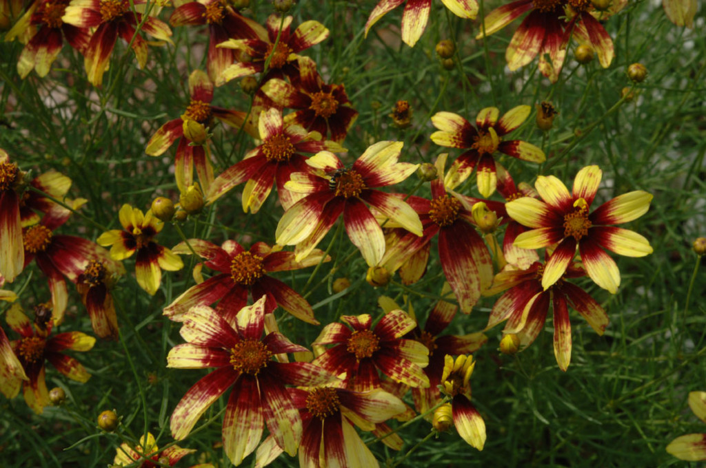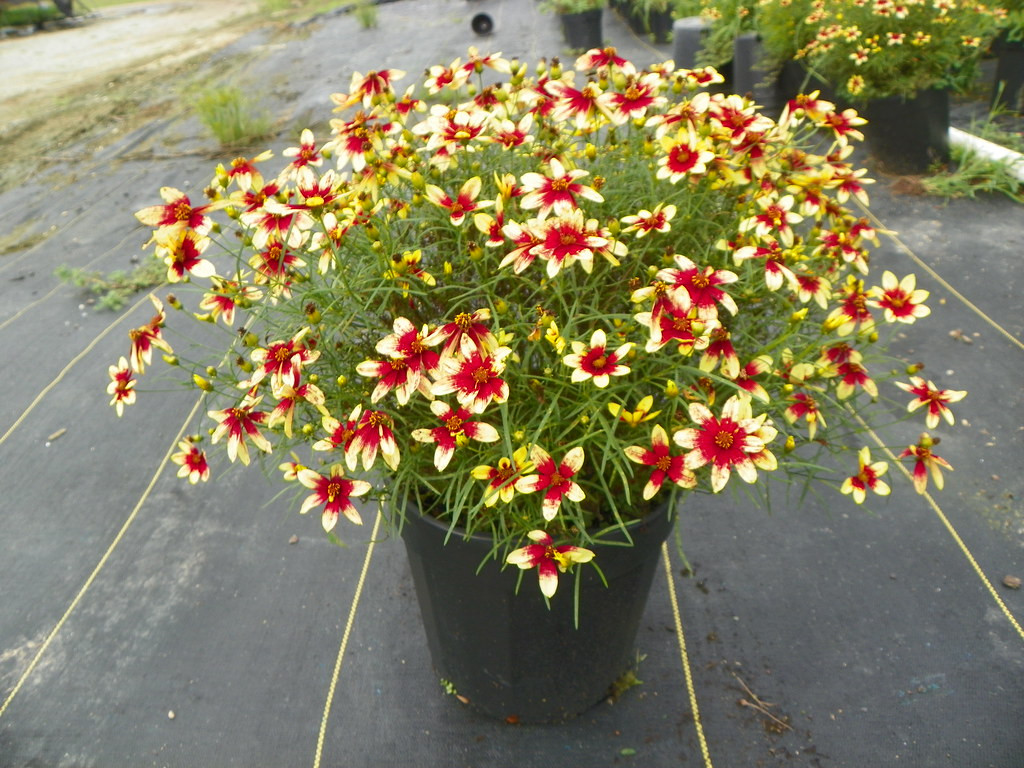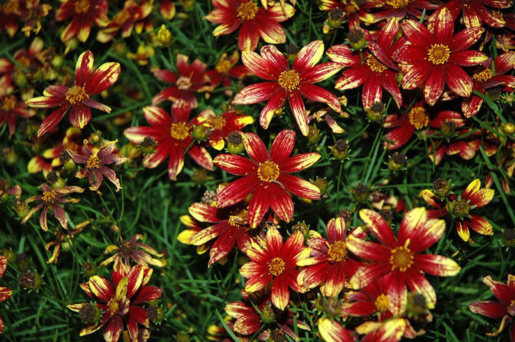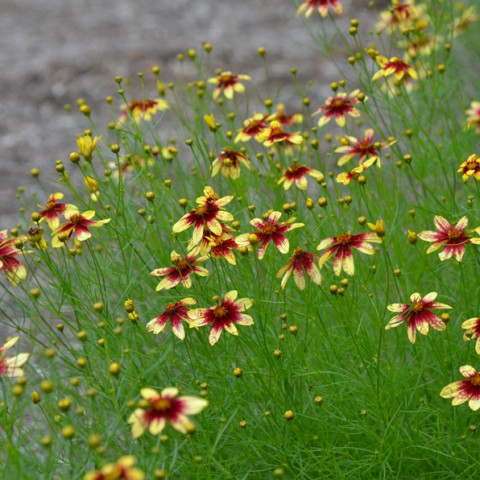 Coreopsis ‘Route 66’, çiçekleriyle yüksek dekoratif değer sunan bir kültivardır. Çiçekler papatya formundadır ve taç yapraklar sarı zemin üzerine bordo veya koyu kırmızı merkez halkalarla çevrilidir. Bu belirgin renk kontrastı, bitkinin uzaktan fark edilmesini sağlar. Çiçekler sağlam saplar üzerinde taşınır ve bitkinin tamamına dengeli şekilde dağılır. Çiçeklenme genellikle yaz başında başlar ve uygun koşullarda yaz sonuna, hatta sonbaharın ilk dönemlerine kadar devam edebilir. Solmuş çiçeklerin düzenli olarak temizlenmesi, yeni tomurcuk oluşumunu destekler ve çiçeklenme süresini uzatır.