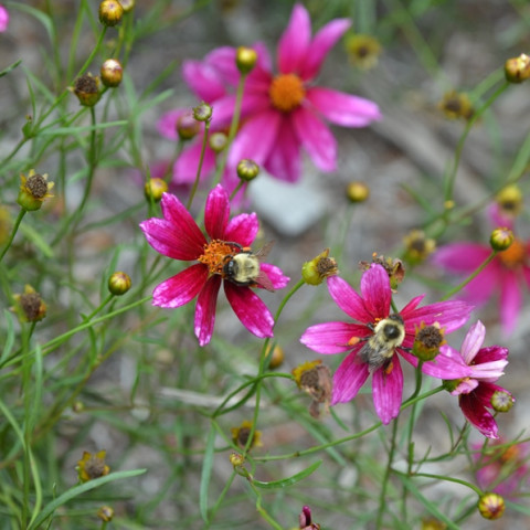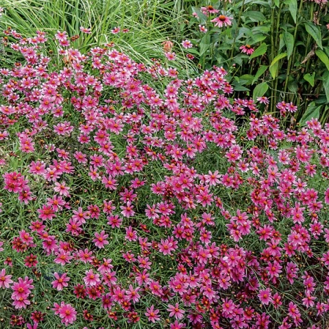 Coreopsis ‘Show Stopper’, çiçek yapısı ile adını hak eden bir kültivardır. Çiçekler iri, gösterişli ve yoğun renkli bir yapıya sahiptir. Taç yapraklar genellikle parlak sarı zemin üzerine pembe - mor tonlarında merkez halkalarla süslenmiştir. Bu renk kontrastı, bitkinin uzaktan dahi fark edilmesini sağlar. Çiçekler papatya formundadır ve güçlü saplar üzerinde taşınır. Çiçeklenme dönemi genellikle yaz başında başlar ve uygun koşullarda yaz sonuna, hatta sonbaharın ilk dönemlerine kadar devam edebilir. Solmuş çiçeklerin düzenli olarak temizlenmesi, yeni tomurcuk oluşumunu teşvik eder ve çiçeklenme süresinin uzamasına katkı sağlar.