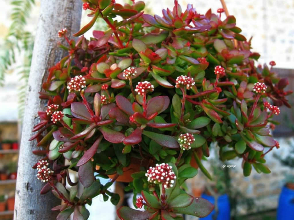 Crassula atropurpurea var. anomala çiçeklenme potansiyeline sahip bir varyetedir. Çiçekler genellikle ilkbahar sonu ile yaz başında görülür. Küçük, yıldız formunda ve beyazdan açık pembe tonlara kadar değişen çiçekler, sürgün uçlarında salkım şeklinde gelişir. Çiçeklenme, bitkinin yeterli ışık alması ve genel sağlık durumu ile doğrudan ilişkilidir. Uygun bakım koşulları sağlandığında düzenli çiçeklenme gözlemlenebilir.