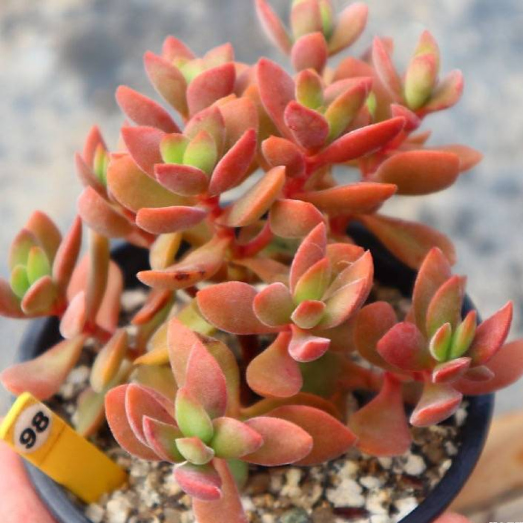 Crassula atropurpurea var. watermeyeri, sukulent dünyasının hem dayanıklı hem de görsel olarak değişken karakterli üyelerinden biri olup, özellikle yaprak uçlarındaki renk geçişleriyle tanınır. Crassula atropurpurea sukulentinin varyetesidir. Yapraklar rozet formu içerisinde merkezden dışa doğru dizilir. Yaprak formu geniş ovalden spatula benzeri şekillere kadar değişebilir; uç kısımlar genellikle yuvarlatılmıştır. Yaprak dokusu kalın ve etlidir, bu yapı su depolama kapasitesini artırır. Yaprak yüzeyi pürüzsüzdür ve belirgin bir tüylenme göstermez. Renklenme çoğunlukla yeşil tonlarda başlar; ancak yüksek ışık koşullarında yapraklar koyu bordo, morumsu kırmızı veya bakır tonlarına kadar koyulaşabilir. Bu yoğun renklenme, atropurpurea grubunun karakteristik özelliklerinden biridir. Düşük ışık koşullarında ise yapraklar daha açık yeşil renkte kalabilir. Uzun süreli aşırı nem, bu etli yaprak dokusunda yumuşama ve hücresel bozulmalara yol açabilir.
