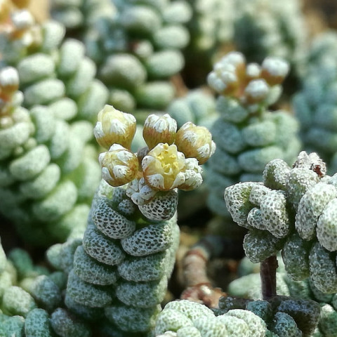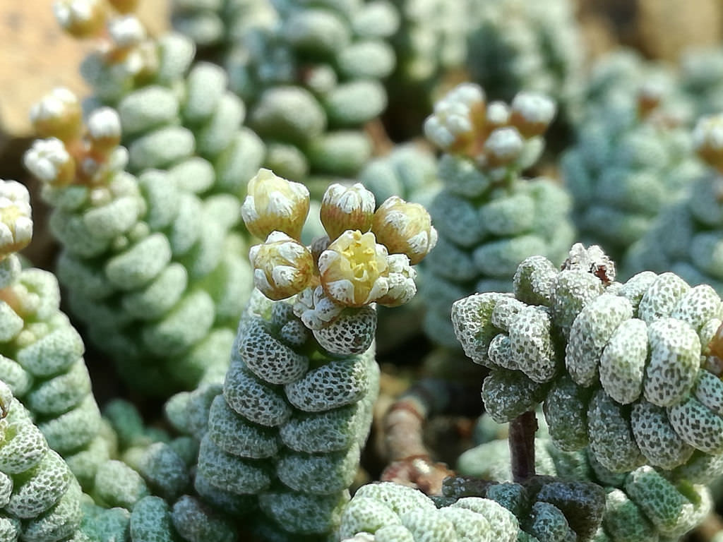 Gübreleme ihtiyacı düşüktür. İlkbahar döneminde, çok düşük dozda ve seyrek aralıklarla sukulentler için formüle edilmiş gübreler kullanılabilir. Aşırı gübreleme bitkinin dokusal yapısını zayıflatır ve doğal kompakt görünümün bozulmasına neden olabilir. Besin uygulamaları büyümeyi hızlandırmak amacıyla değil, yalnızca destekleyici olarak değerlendirilmelidir. Crassula corallina çiçekleri küçük, yıldız formunda ve genellikle sarı tonlardadır. Çiçekler sürgün uçlarında veya yaprakların arasından kısa çiçek sapları üzerinde açar. Çiçeklenme dönemi çoğunlukla ilkbahar sonu ile yaz başına denk gelir. Çiçekler kısa ömürlüdür ancak yoğun yaprak dokusu arasında belirgin bir kontrast oluşturarak bitkinin estetik değerini artırır. Çiçeklenme, bitkinin yeterli ışık alması ve sağlıklı gelişim göstermesiyle doğrudan ilişkilidir.