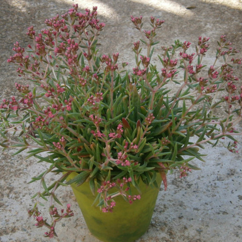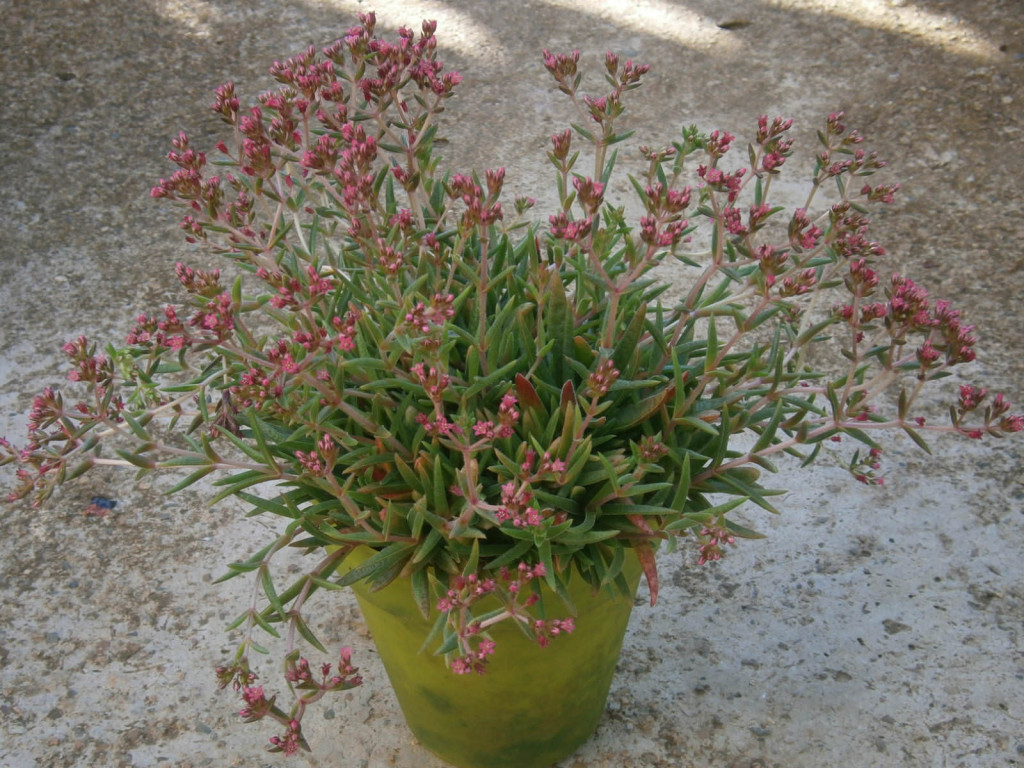 Crassula exilis subsp. schmidtii, Crassulaceae familyasına ait yoğun çiçeklenmesiyle öne çıkan bir Crassula exilis alt türüdür. Doğal yayılım alanı Güney Afrika’nın kurak ve yarı kurak bölgeleridir. Tür, ince toprak tabakalarının bulunduğu taşlık arazilerde, kaya aralıklarında ve açık alanlarda yaşamını sürdürür. Bu bölgelerde yağışlar düzensizdir ve su, toprakta uzun süre tutulmaz. Bitki bu koşullara uyum sağlayarak düşük boylu, sık dokulu ve toprak yüzeyine yakın bir gelişim biçimi kazanmıştır. Zamanla çevresine doğru yayılarak yoğun kümeler oluşturur. Genel formu düzenli, yuvarlak ve dengelidir. Bu özellikleri sayesinde sığ saksılar ve kaya bahçeleri için uygun bir tür olarak değerlendirilir. Crassula exilis subsp. schmidtii’nin yaprakları dar, etli ve mızraksı forma yakındır. Yapraklar gövde üzerinde karşılıklı dizilir ve sürgün uçlarında daha sık bir görünüm oluşturur. Renkleri çoğunlukla yeşil tonlarda olup, yoğun ışık altında kırmızımsı veya bordo renklenmeler gösterebilir. Yaprak uçlarında ve kenarlarında renk yoğunluğu daha belirgin hale gelir. Düşük ışık koşullarında yapraklar daha açık yeşil kalır ve boğum araları uzayarak bitkinin kompakt formu zayıflar. Yaprak dokusu uzun süre nemli kaldığında yumuşamaya eğilimlidir ve bu durum çürüme riskini artırır.