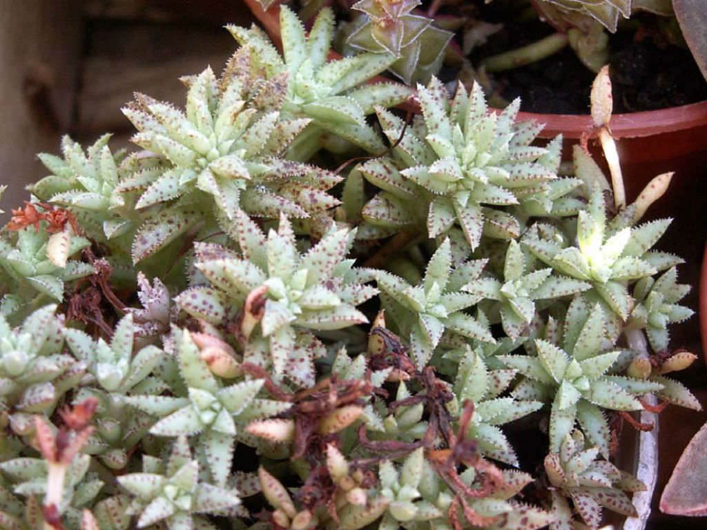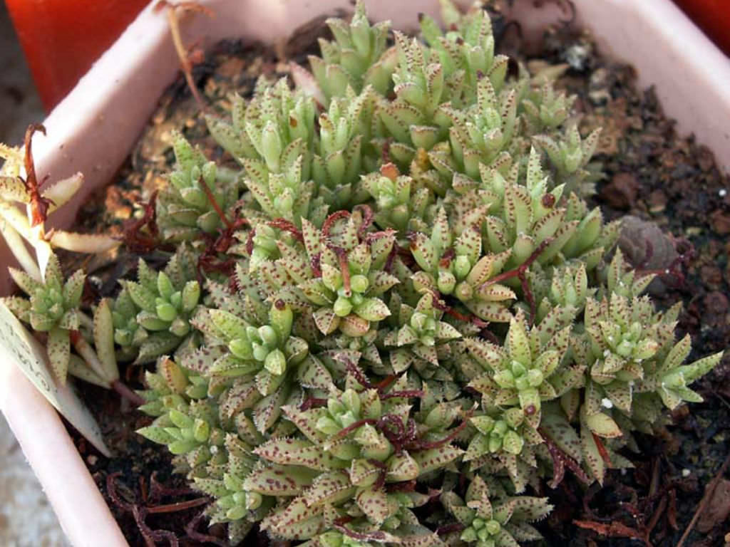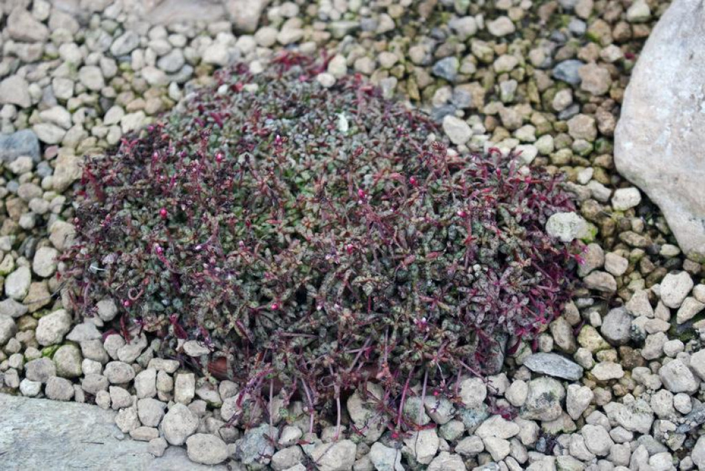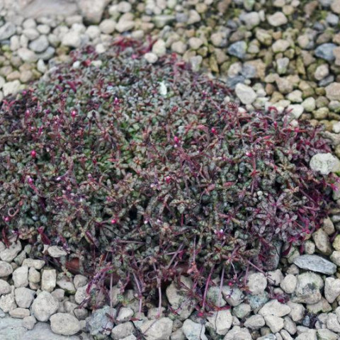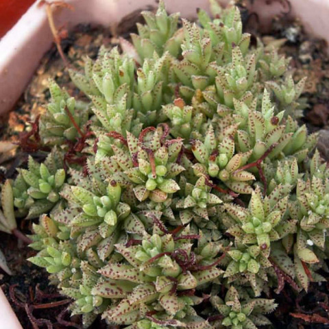 Crassula exilis subsp. sedifolia, Crassulaceae familyasına ait, küçük rozetler oluşturarak gelişen ve yüzeye yakın büyüyen bir Crassula exilis alt türüdür. Doğal yayılım alanı Güney Afrika’nın yarı kurak bölgeleridir. Tür, çoğunlukla taşlık arazilerde, kaya aralıklarında ve çok ince toprak tabakalarının bulunduğu alanlarda yaşamını sürdürür. Bu habitatlarda yağış düzensizdir ve su, kısa sürede ortamdan uzaklaşır. Bitki bu koşullara uyum sağlayarak düşük boylu, sık dokulu ve kompakt bir gelişim biçimi kazanmıştır. Toprağa yakın konumlanan rozetler zamanla çevresine yayılır ve yastık benzeri kümeler oluşturur. Genel görünüm, yoğun fakat düzenli bir yapı sergiler. Bu özellikleriyle kaya bahçeleri ve sığ saksılar için oldukça uygundur. Crassula exilis subsp. sedifolia’nın yaprakları küçük, etli ve belirgin şekilde yoğun dizilimlidir. Yapraklar rozet merkezinden dışa doğru sıkı bir düzenle yerleşir. Yaprak formu kısa ve hafif sivri uçludur. Yaprak yüzeyi ince tüylerle kaplıdır ve bu tüyler yaprak kenarlarında daha belirgin hale gelir. Yüzey dokusu pütürlüdür ve bu yapı bitkiye mat bir görünüm kazandırır. Yaprak zemin rengi açık yeşil tonlardadır. Üzerinde koyu kırmızıdan bordo tonlarına kadar değişebilen beneklenmeler bulunur. Işık şiddeti arttıkça bu benekler daha belirgin hale gelir ve yaprak uçlarında kızarıklık artar. Düşük ışık koşullarında yapraklar daha yeşil kalır, benekler silikleşir ve rozet yapısı gevşeyebilir. Yaprak dokusu uzun süre nemli kaldığında yumuşamaya eğilimlidir. Bu alttür, yüksek aydınlık isteyen sukulentler arasında yer alır. Doğrudan güneş ışığı, rozetlerin kompakt kalmasını ve yaprak desenlerinin netleşmesini destekler. Günün sabah saatlerinde alınan güneş, sağlıklı gelişim için uygundur. İç mekânda yetiştirilecekse, gün boyu ışık alan bir pencere önü tercih edilmelidir. Yetersiz ışık koşullarında sürgünler uzar, rozetler açılır ve bitkinin karakteristik görünümü zayıflar. Dış mekânda bakıldığında yaz aylarında aşırı yakıcı öğle güneşi yapraklarda stres oluşturabilir. Bu nedenle yarı gölgeli ancak aydınlık alanlar daha dengeli gelişim sağlar.