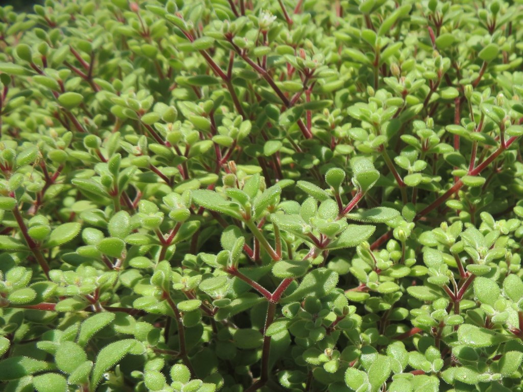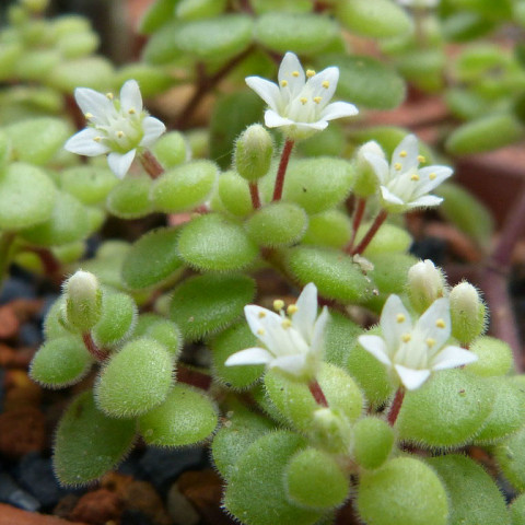 Yapraklar karşılıklı dizilimlidir ve kısa boğum aralıkları sayesinde sık bir doku meydana getirir. Yaprak formu ovalden yuvarlağa yakın şekillere kadar değişkenlik gösterebilir. Yapraklar etli yapıdadır ancak Crassula cinsinin birçok türüne kıyasla daha ince ve narin bir dokuya sahiptir. Yaprak yüzeyi yoğun şekilde kısa tüylerle kaplıdır. Bu ince tüylenme, yapraklara kadifemsi bir görünüm kazandırır ve doğrudan güneş ışığında su kaybını sınırlayan koruyucu bir tabaka görevi görür. Yaprak rengi genellikle açık yeşil tonlardadır. Yüksek ışık koşullarında yaprak kenarlarında ve gövde boğumlarında kırmızımsı veya pembemsi renklenmeler gözlemlenebilir. Düşük ışıkta ise bitki daha soluk yeşil renkte kalır.