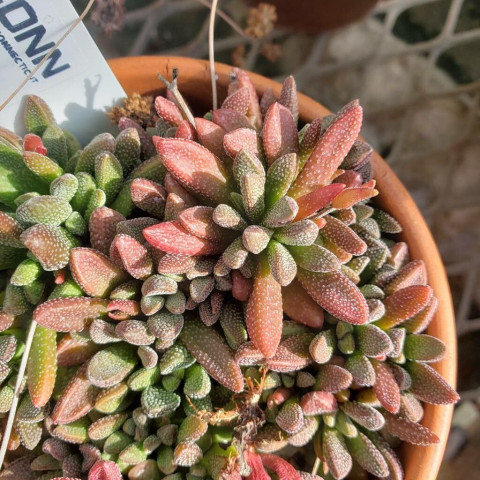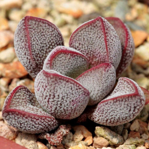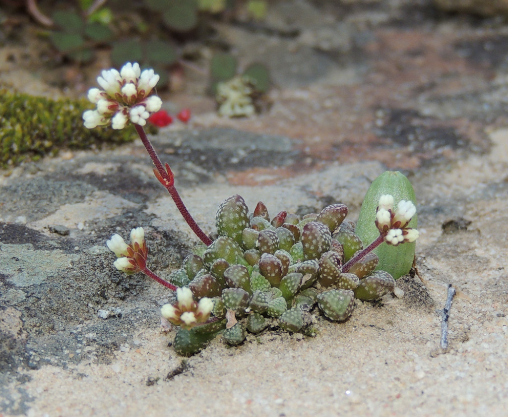 Crassula fragarioides, Güney Afrika’nın özellikle Cape bölgesine özgü, düşük boylu ve yoğun kümeler oluşturan nadir Crassula türlerinden biridir. Doğal yaşam alanında kayalık yüzeylerde, ince kumlu ve mineral ağırlıklı topraklar üzerinde yayılım gösterir. Bitki, yere yakın büyüyen kompakt rozetler oluşturur ve zamanla yanlardan sürgün vererek halı benzeri koloniler meydana getirir. Yapraklar küçük, etli ve yuvarlağa yakın formdadır. Yaprak yüzeyinde belirgin, tanecikli ve pütürlü bir doku bulunur. Bu yapı, bitkiye mat ve kristalimsi bir görünüm kazandırır. Yoğun ışık altında yaprak renkleri yeşilden kırmızımsı tonlara doğru değişebilir. Gövde çok kısa ve çoğu zaman toprak seviyesinde gizlidir. Baharda, doğru bakımla beyaz - sarı renkte çiçekler açar.