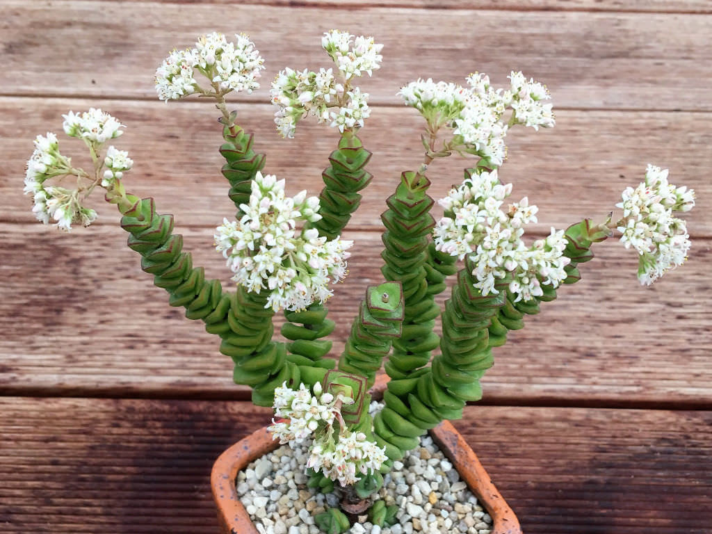 'Jade Necklace', kış sonu veya ilkbahar başında gövde uçlarında kümeler halinde açan küçük, yıldız formunda, beyaz veya açık pembe çiçeklerle bezenir. Çoğaltma işlemi gövde çelikleri ile oldukça basittir. Sağlıklı bir gövde parçası kesilip 2-3 gün boyunca yara yerinin kuruması beklendikten sonra geçirgen bir toprağa dikilir. Kökleşme süreci tamamlanana kadar doğrudan güneşten korunmalı ve toprak hafif nemli tutulmalıdır. Gübreleme, sadece aktif büyüme mevsiminde (bahar ayları),ayda bir kez ve yarı dozda seyreltilmiş sıvı sukulent gübresi ile yapılarak bitkinin gelişimi desteklenebilir.
