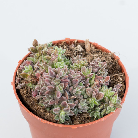 Toprak seçimi bu varyetenin bakımında temel belirleyicidir. Kök sistemi uzun süre nemli kalan ortamlara karşı hassastır. Bu nedenle suyu hızlı tahliye eden, hava geçirgenliği yüksek ve mineral ağırlıklı karışımlar tercih edilmelidir. Ponza, perlit ve iri taneli kum içeren karışımlar uygundur. Organik madde oranı sınırlı tutulmalıdır. Toprak saksı, kök çevresindeki nemin daha hızlı dengelenmesine katkı sağlar ve çürüme riskini azaltır. Saksının drenaj deliğine sahip olması zorunludur. Sulama uygulamalarında temel prensip, toprağın tamamen kurumasını beklemektir. Sulama öncesinde yalnızca üst yüzeyin değil, saksı içindeki tüm karışımın kuru olduğundan emin olunmalıdır. Crassula lanuginosa var. pachystemon, kısa süreli kuraklığa dayanıklıdır ancak sürekli nemli toprakta kök ve gövde çürümesine yatkındır. Sulama sırasında yaprakların ve özellikle tüylerle kaplı yüzeylerin ıslatılmaması önemlidir; bu bölgelerde kalan nem mantari sorunlara zemin hazırlayabilir.