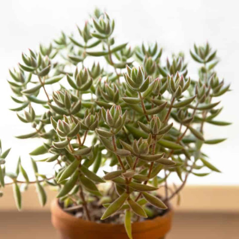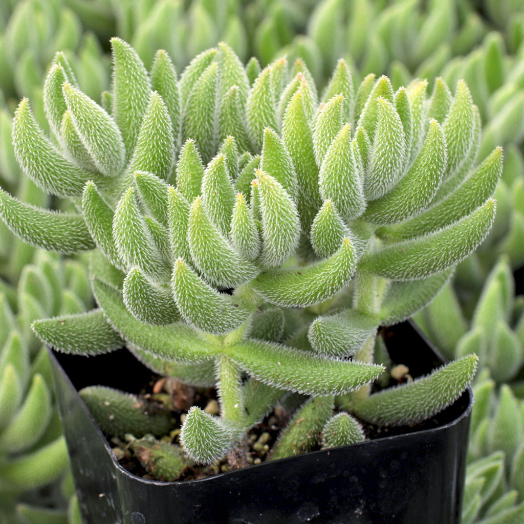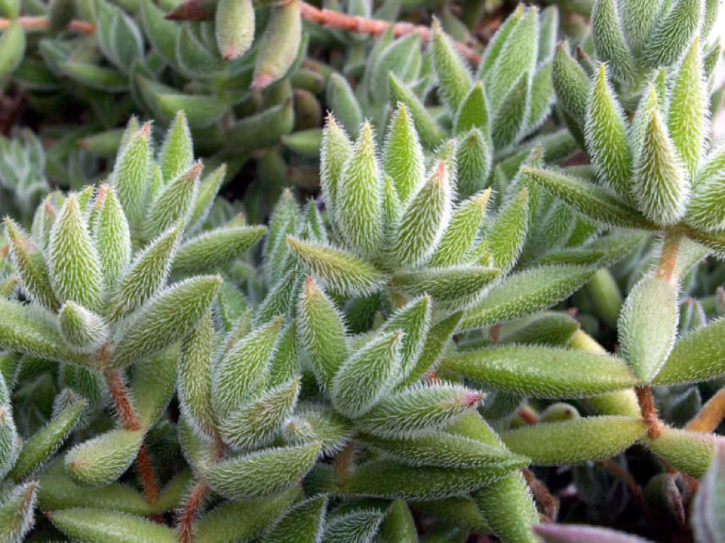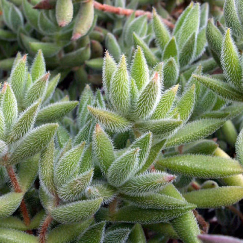 Crassula mesembryanthoides, Güney Afrika kökenli, yere yakın büyüyen ve yoğun dokulu yapraklarıyla ayırt edilen özel bir Crassula türüdür. Doğal ortamında çoğunlukla kumlu, taşlı ve iyi drene olan alanlarda gelişir. Bitki genellikle alçak rozetler veya kısa gövdeli kümeler oluşturur. Yapraklar kalın, etli ve sık dizilimlidir. Yüzeyleri ince tüylerle kaplıdır ve bu tüylenme bitkiye kadifemsi, gri-yeşil bir görünüm kazandırır. Bu yapı, bitkinin yoğun güneş ışığına ve kurak koşullara uyum sağlamasında önemli rol oynar.