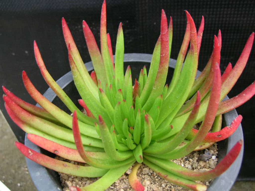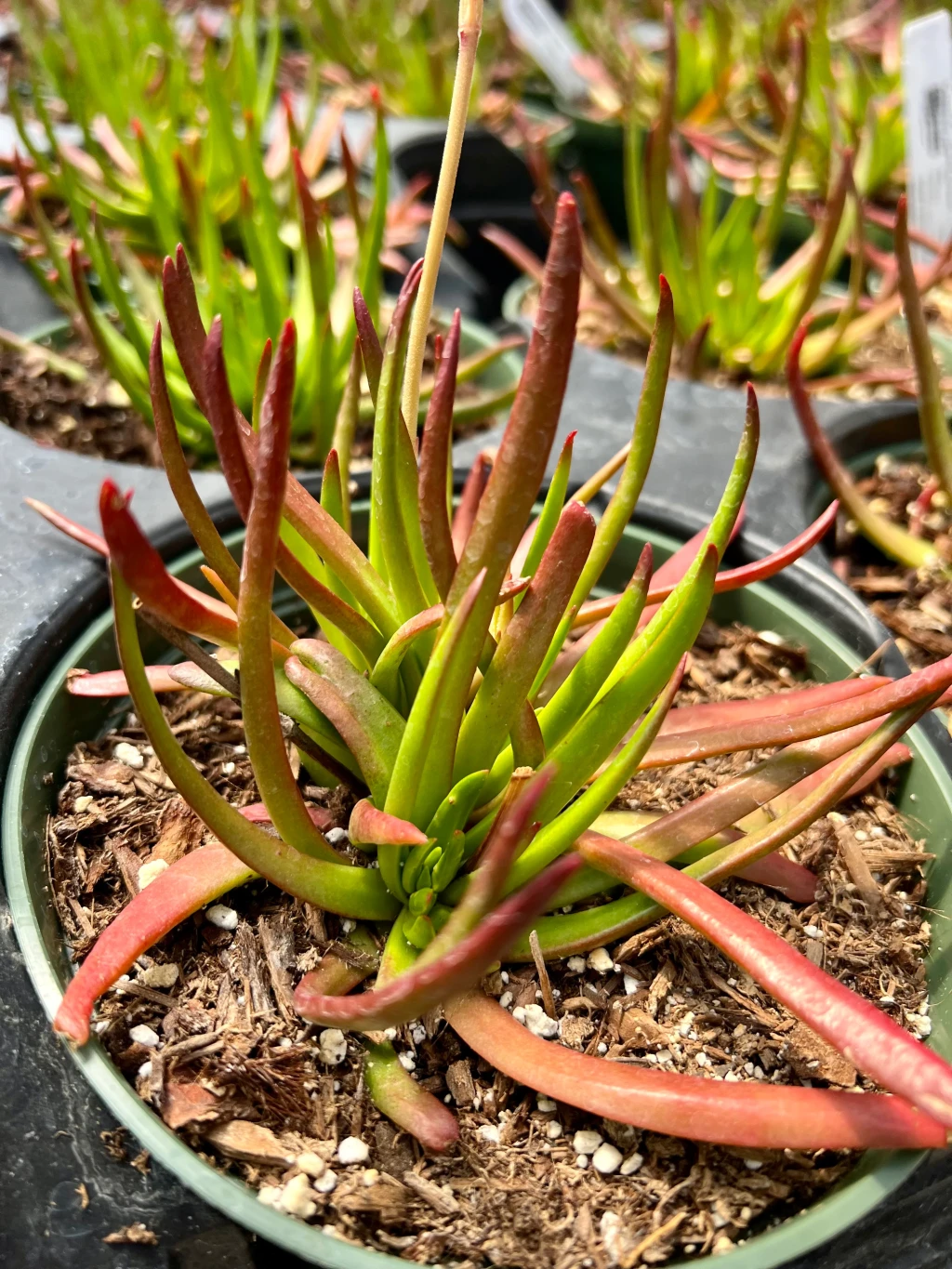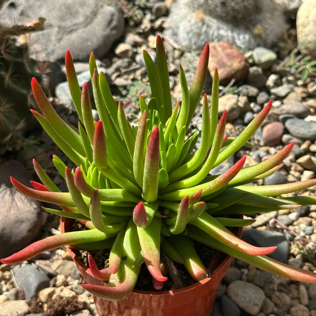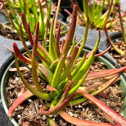 Crassula nudicaulis ‘Devil’s Horns’, Crassulaceae familyası içerisinde yer alan ve Crassula nudicaulis türünün varyetesidir. Bu form, adını yapraklarının yukarı doğru kıvrılan, daralan ve boynuz benzeri siluetinden alır. Güney Afrika kökenli Crassula nudicaulis türü, doğal habitatında genellikle yarı kurak bölgelerde, taşlık ve iyi drene olan topraklarda gelişim gösterir. ‘Devil’s Horns’ kültivarı, türün dayanıklı yapısını korurken, daha dramatik ve heykelsi bir görsel karakter sergiler. Bitki, etli yaprak ve gövde dokuları sayesinde su depolama kapasitesi yüksek bir sukulenttir ve uygun koşullarda dengeli bir gelişim gösterir. Yapraklar tabanda rozet benzeri bir düzen içerisinde başlar ve yukarı doğru uzayan, daralan bir form sergiler. Yaprak uçları belirgin şekilde sivridir ve çoğu zaman içe ya da dışa doğru kıvrılarak boynuz görünümünü güçlendirir. Yapraklar kalın, etli ve sert dokuludur. Renklenme çoğunlukla gri-yeşil, soluk yeşil veya zeytin tonlarında görülür. Yüksek ışık koşullarında yaprak uçlarında ve dış yüzeylerinde kırmızı, bordo ya da morumsu tonlar ortaya çıkabilir. Bu renklenme, bitkinin ışık yoğunluğuna verdiği fizyolojik bir tepki olarak değerlendirilir. Uzun süreli aşırı nem, yaprak dokusunda yumuşama ve şekil bozulmalarına neden olabilir.