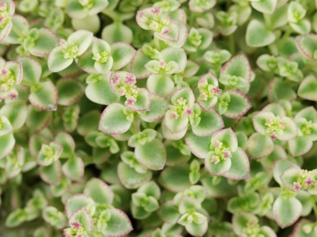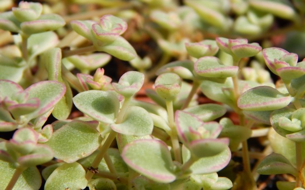 Crassula pellucida subsp. marginalis ‘Petite Bicolor’ yaprakları karşılıklı dizilimlidir ve ince, esnek gövdeler boyunca düzenli aralıklarla yer alır. Yaprak formu küçük, yuvarlağa yakın oval ya da hafif kalp formunu andıran bir yapıdadır. Yaprak uçları genellikle yuvarlatılmıştır. Yaprak dokusu etli ancak kalın değildir; bu durum bitkiye zarif bir görünüm kazandırır. Yaprak yüzeyi pürüzsüzdür ve tüylenme içermez. Renklenme iki tonlu bir karakter gösterir. Yaprak merkezleri çoğunlukla açık yeşil veya soluk krem tonlarındadır; kenar bölgelerinde ise pembe, kırmızı veya morumsu bir sınır hattı belirgindir.