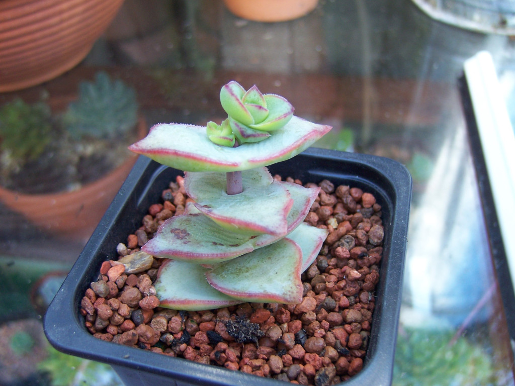 Crassula perforata ‘Giant Form’, Crassulaceae familyası içinde yer alan Crassula perforata türünün iri yapılı, daha güçlü gövde ve yaprak oranlarına sahip seçilmiş bir formudur. “Giant Form”, Crassula perforata formlarına kıyasla daha kalın gövde ve daha geniş yaprak geliştirir. Doğal kökeni Güney Afrika’ya dayanan bu form, kurak ve yarı kurak bölgelerin düzensiz yağış rejimine uyum sağlayacak şekilde etli dokular geliştirmiştir. Saksı ortamında yetiştirildiğinde, uygun koşullar altında dikkat çekici ölçülere ulaşabilen mimari bir sukulent olarak değerlendirilir. Bitki genellikle dik ya da yarı dik gelişim gösterir. Gövdeler silindirik, etli ve belirgin biçimde kalındır. Boğum aralıkları tip formdan daha net algılanır ve bu durum bitkiye daha güçlü, heykelsi bir görünüm kazandırır. Zamanla tabandan dallanma eğilimi gösterebilir ve birden fazla dik sürgün oluşturarak hacimli bir yapı meydana getirebilir. Gövde yüzeyi pürüzsüzdür ve tüylenme içermez. Yaşlı bireylerde alt kısımlarda hafif sertleşme görülebilir ancak belirgin bir odunsu yapı gelişmez.
