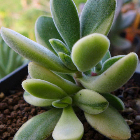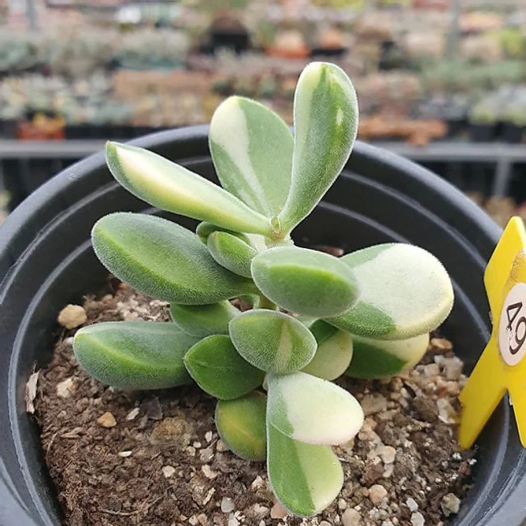 Crassula rogersii ‘Variegata’, Crassulaceae familyasına ait Crassula rogersii türünün alacalı formlarından biridir ve yaprak yüzeyindeki krem–sarı ile açık yeşil tonların dengeli dağılımı ile ayırt edilir. Türün kökeni Güney Afrika’nın yarı kurak bölgelerine dayanır. Bu coğrafyada bitki, kısa süreli yağışlar, yoğun ışık ve hızlı kuruyan toprak koşullarına uyum sağlayarak gelişmiştir. Variegata formda klorofil dağılımı homojen değildir. Bu durum, bitkinin görsel değerini artırırken ışık ihtiyacını da düz yeşil formlara kıyasla daha hassas hale getirir. Crassula rogersii ‘Variegata’ genellikle bodur ve yavaş büyüyen bir gelişim gösterir. Yapraklar etli, oval ile hafif silindirik form arasında değişir ve kısa saplıdır. Yaprak yüzeyi ince, kadifemsi bir tüylenme ile kaplıdır. Bu tüylenme, türün karakteristik özelliklerinden biridir ve yapraklara mat bir görünüm kazandırır. Alacalı formda yaprakların bir kısmı açık krem veya sarımsı renkte, diğer kısımları ise açık yeşil tonlardadır. Işık düzeyi arttıkça yaprak uçlarında ve kenarlarında pembe ya da kırmızımsı tonlar belirginleşebilir.