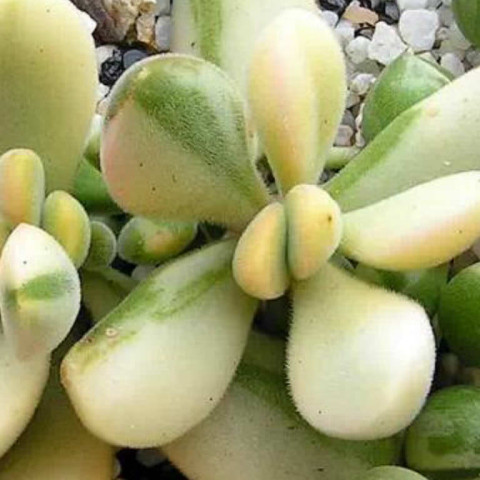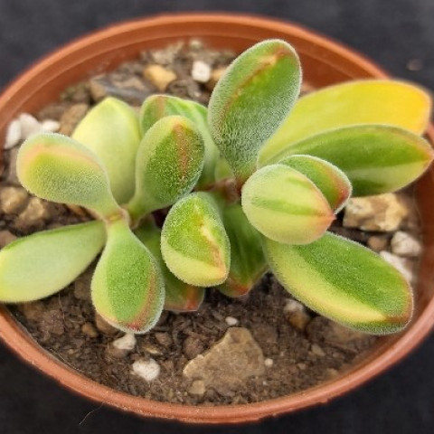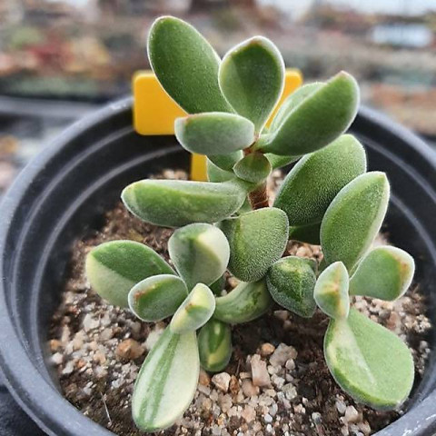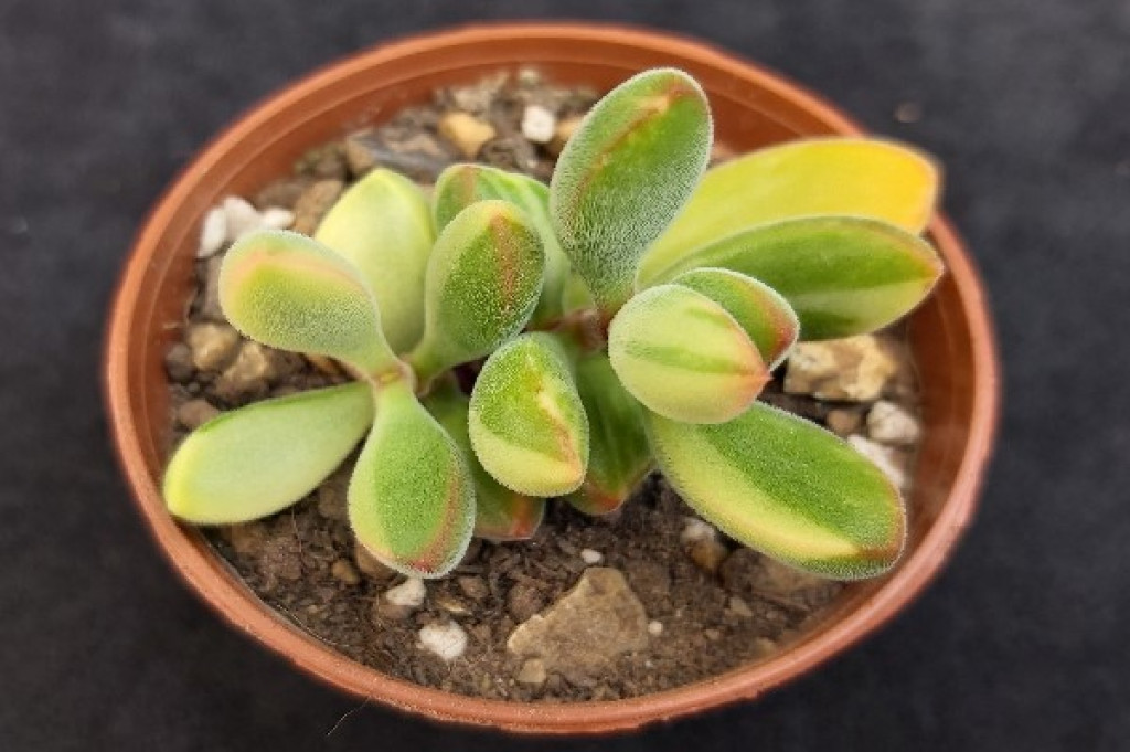 Crassula rogersii ‘Variegata’, Crassulaceae familyası içerisinde yer alan Crassula rogersii türünün alacalı (variegata) formlarından biridir. Bu kültivar, türün kompakt gelişim karakterini korurken yaprak yüzeyinde görülen açık renkli desenlenmeler sayesinde görsel olarak belirgin şekilde ayrışır. Güney Afrika kökenli olan Crassula rogersii grubu, doğal yaşam alanlarında yarı kurak bölgelerde, taşlık ve iyi drene olan topraklarda gelişim gösterir. ‘Variegata’ formu, genetik olarak yaprak pigment dağılımının düzensizliği sonucu ortaya çıkan açık ve koyu renkli alanlarla tanımlanır. Bitki, etli yaprak dokusu sayesinde su depolama kapasitesi yüksek bir sukulenttir ve uygun bakım koşullarında yavaş fakat dengeli bir gelişim sergiler.