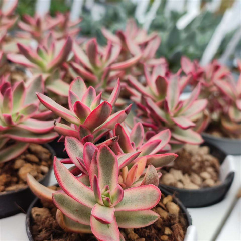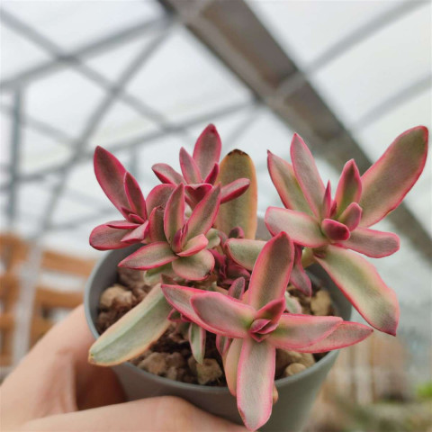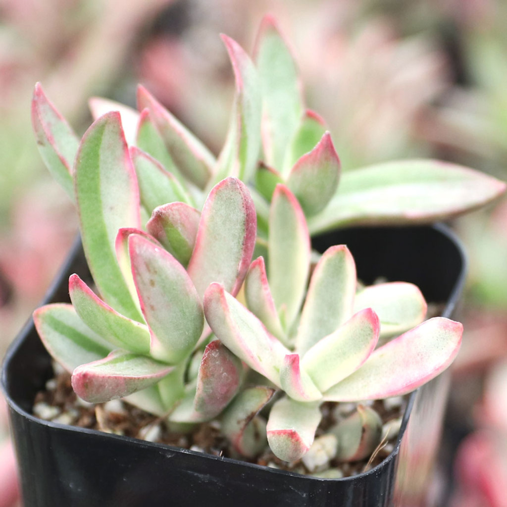 Crassula rubricaulis ‘Candy Cane’, Crassulaceae familyasına ait Crassula rubricaulis türünün alacalı bir kültivarıdır. Doğal tür Güney Afrika’nın kurak ve yarı kurak bölgelerine özgüdür. Bu kültivar, özellikle yaprak kenarlarında belirginleşen krem-beyaz ile açık yeşil bantlar ve yüksek ışık altında ortaya çıkan pembe-kırmızı tonlarıyla tanınır. “Candy Cane” adı, yapraklarda oluşan bu çizgili ve kontrastlı renk dağılımına atıfta bulunur. Bitki yarı dik gelişim gösterir ve zamanla dallanarak orta boylu, dengeli bir form kazanır. Alacalı yapısı nedeniyle büyüme hızı, düz yeşil formlara kıyasla daha yavaştır. Yapraklar etli, oval ile eliptik form arasında değişir ve karşılıklı dizilmiştir. Yaprak yüzeyi pürüzsüzdür ve hafif parlak bir dokuya sahiptir. Alacalı desen genellikle yaprak kenarlarında krem veya beyaz bantlar şeklinde görülür. Yaprağın merkez kısmı açık yeşil tonlardadır. Yeterli ışık alındığında, özellikle serin gecelerle birlikte, yaprak kenarlarında pembe veya kırmızı renklenme belirginleşir.