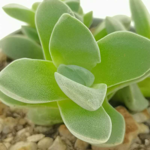 Crassula sericea var. velutina, Crassulaceae familyasına ait Crassula sericea türünün tanımlanmış varyetelerinden biridir. “Velutina” tanımı, bu varyetenin yapraklarında belirgin şekilde hissedilen yumuşak ve tüylü görünümlü yüzey yapısına karşılık gelir. Doğal yaşam alanlarında yarı kurak iklim koşullarına uyum sağlamış olan bu varyete, mineral ağırlıklı, geçirgen ve düşük organik içerikli zeminlerde gelişim gösterir. Bu çevresel adaptasyon, bitkinin suyu depolayabilen etli yapraklar geliştirmesine ve kurak dönemlere dayanıklı bir yapı kazanmasına olanak tanır. Gövde yapısı genellikle kısa boğumlu olup, bitki zamanla tabandan dallanarak kompakt kümeler oluşturabilir. Crassula sericea var. velutina’nın yaprakları etli, kalın ve su depolama kapasitesine sahiptir. Yaprak formu çoğunlukla ovalden yuvarlağa yakın bir yapı gösterir ve gövde üzerinde karşılıklı dizilimlidir. Yaprak yüzeyi, varyeteye özgü olarak yoğun, homojen ve kadifemsi bir kaplama ile örtülüdür. Bu yüzey yapısı, bitkiye mat bir görünüm kazandırırken aynı zamanda doğrudan güneş ışığına ve buharlaşmaya karşı koruyucu bir tabaka işlevi görür. Yaprak renkleri genellikle açık gri-yeşil, gümüşü yeşil veya soluk yeşil tonlarındadır. Işık yoğunluğuna bağlı olarak renk tonlarında hafif açılmalar veya matlaşmalar gözlemlenebilir. Düşük ışık koşullarında yaprak dokusu incelme eğilimi gösterebilir ve gövde uzaması görülebilir.