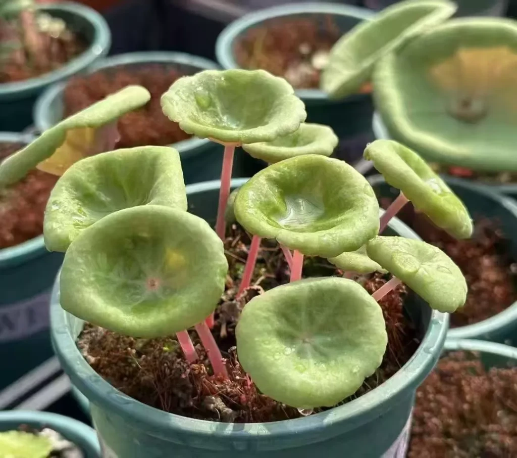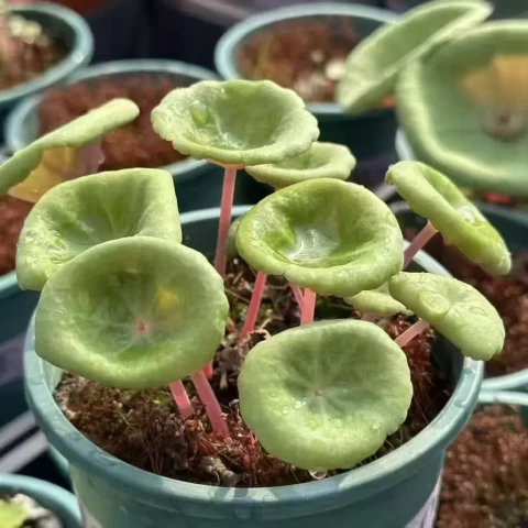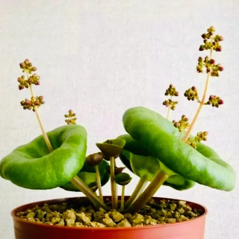 Crassula umbella ‘Wine Cup’, Crassulaceae familyasına ait Crassula umbella türünün seçilmiş ve görsel açıdan dikkat çeken bir alt türüdür. Yapraklar etli, kalın ve geniş yapıdadır. Yaprak formu yuvarlağa yakın ya da hafif ovaldir ve gövde üzerinde karşılıklı dizilerek düzenli bir simetri oluşturur. Yapraklar merkeze doğru hafif içbükey yapı kazanır; bu durum bitkiye kadeh veya çanak benzeri bir görünüm verir. “Wine Cup” kültivarını ayırt eden temel özelliklerden biri de bu yaprak geometrisidir. Yaprak yüzeyi pürüzsüz ve mattır. Renklenme, düşük ışık koşullarında daha çok yeşil ve gri-yeşil tonlarda kalırken, yoğun ve dengeli ışık altında bordo, koyu kırmızı ve morumsu tonlara doğru belirgin şekilde koyulaşır. Çiçeklenme döneminde bitki, ince çiçek sapları üzerinde küçük, yıldız formunda çiçekler oluşturur. Çiçekler genellikle sarı tonlardadır.