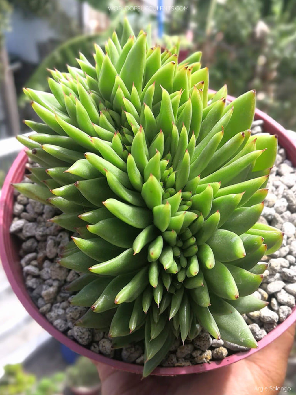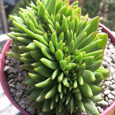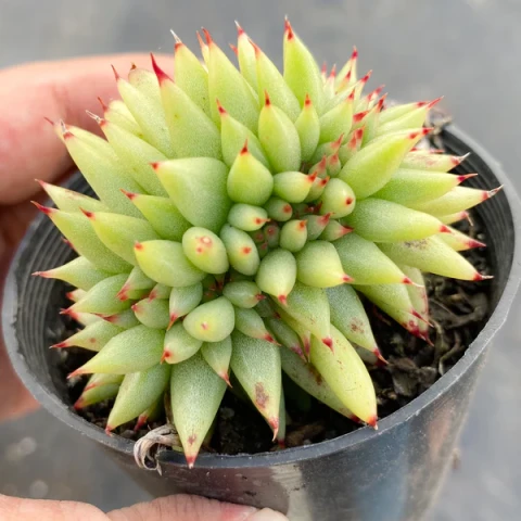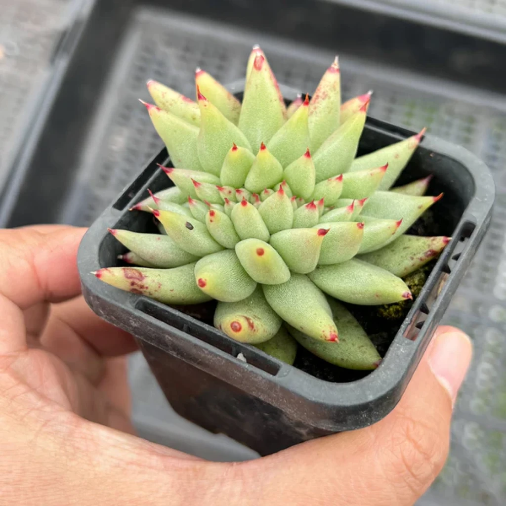 Echeveria agavoides ‘Corderoyi Cristata’, Crassulaceae familyasına ait Echeveria agavoides ‘Corderoyi' türünün tepe meristemi deformasyonu sonucu oluşmuş kristat (crest) formudur. Standart rozet yapısından farklı olarak büyüme noktası çizgisel biçimde genişler ve yelpaze ya da dalgalı bir sırt görünümü oluşturur. Bu anormal fakat stabil büyüme formu, bitkiye heykelsi ve yoğun dokulu bir görünüm kazandırır. Gövde kısa kalır ancak crest hattı boyunca çok sayıda yaprak sık biçimde dizilir. Su depolama kapasitesi yüksek etli yaprak yapısı korunur; buna rağmen kök bölgesinde uzun süreli nem birikimi kristat formlarda daha hızlı doku bozulmasına yol açabilir.