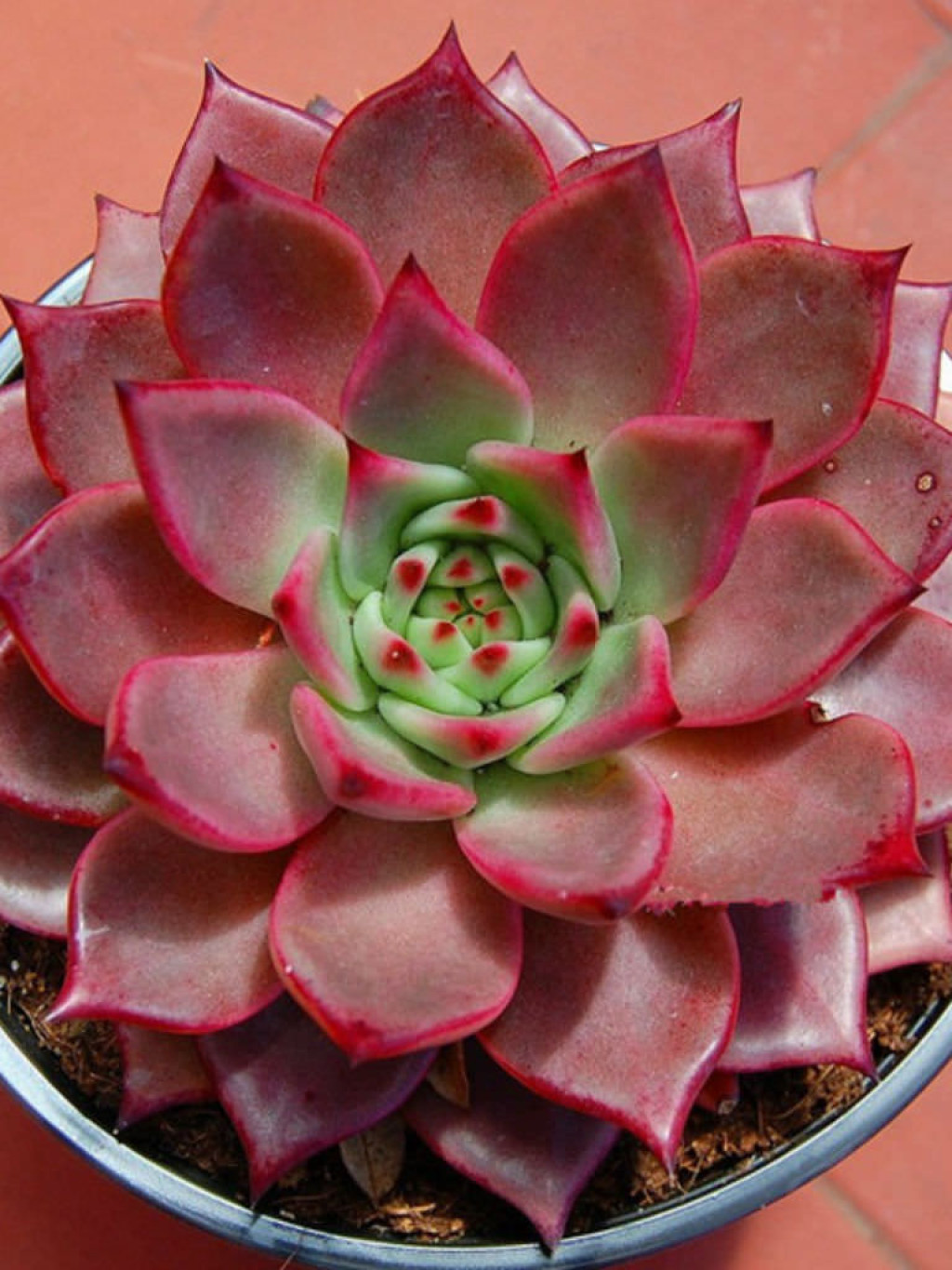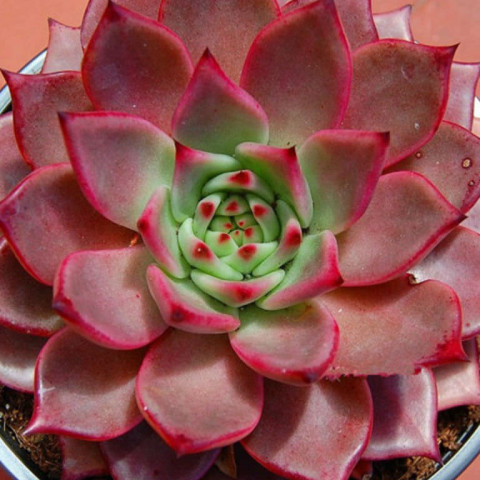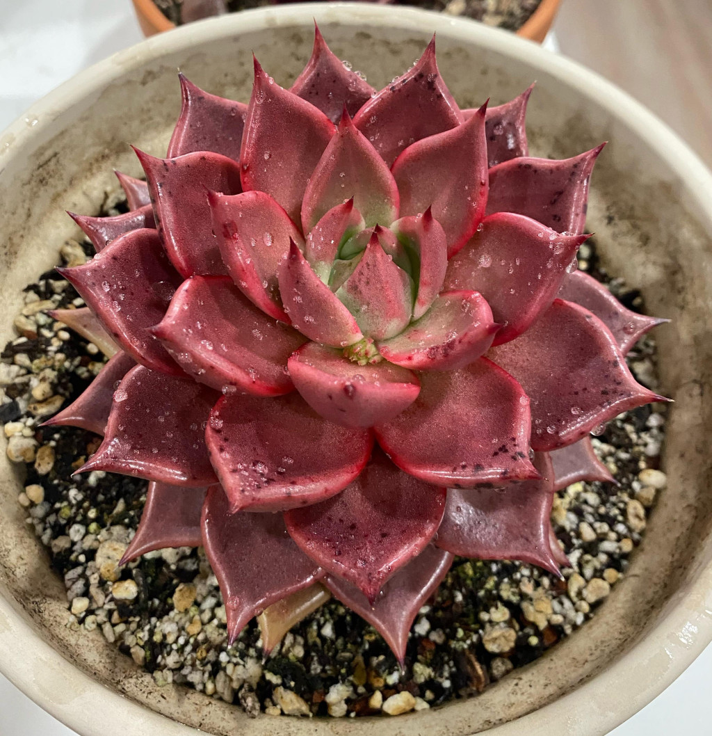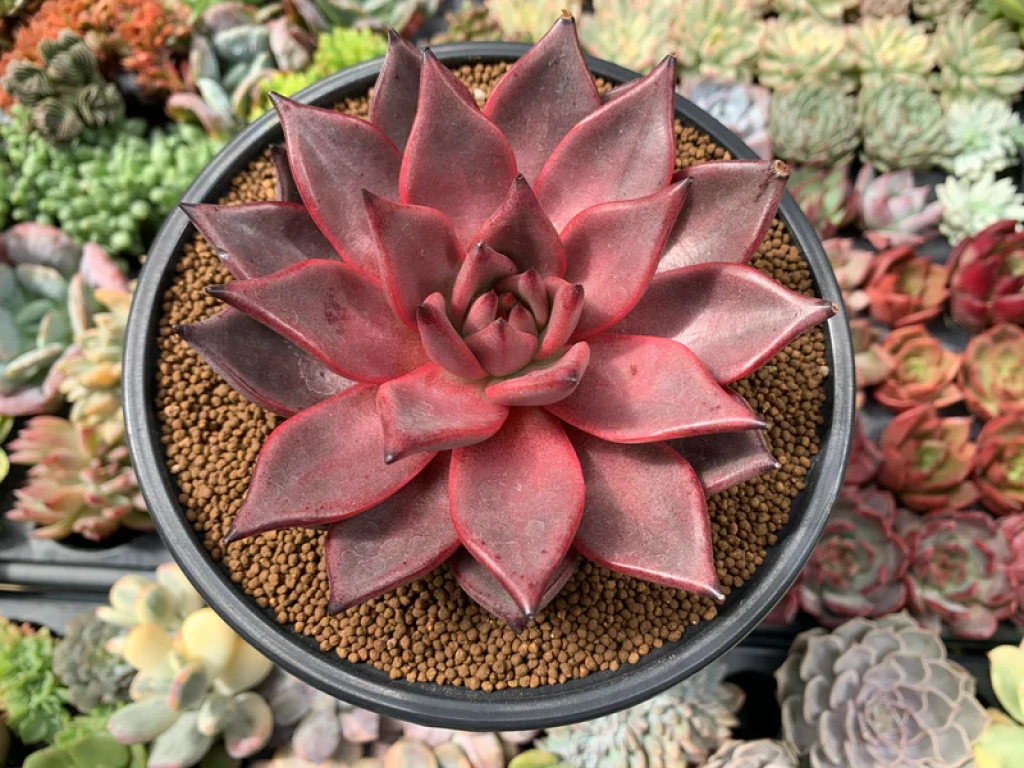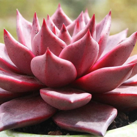 Echeveria agavoides ‘Romeo’, Echeveria agavoides türünün yoğun pigmentasyon gösteren seçilmiş bir kültivarıdır ve güçlü kırmızı tonlarıyla öne çıkar. Bu çeşit, tipik agavoides formunu korur: kompakt, sıkı ve geometrik rozet yapısı. Sağlıklı gelişim gösteren bireylerde rozet oldukça simetriktir ve yapraklar merkezden dışa doğru düzenli spiral dizilimle yerleşir. Yapı genellikle tek rozetlidir; uygun koşullarda dipten yavru verebilir ancak çoğunlukla tek başlı ve güçlü bir form sergiler. Yapraklar kalın, sert dokulu ve belirgin üçgen formdadır. Uçları keskin şekilde sivridir ve agavoides grubunun karakteristik görünümünü yansıtır. Echeveria agavoides ‘Romeo’yu ayıran en önemli özellik, yaprak yüzeyinde oluşan koyu kırmızı, bordo hatta morumsu tonlardır. Yeterli ışık ve uygun stres koşullarında yaprakların tamamı yoğun kırmızıya dönebilir. Merkez kısım bazen daha koyu tonlu görünürken dış yapraklarda renk geçişi daha belirgin olabilir. Işık yetersiz olduğunda bitki daha yeşilimsi ya da donuk kırmızı tonlara dönebilir. Bu nedenle renk performansı büyük ölçüde ışık yoğunluğuna bağlıdır.
