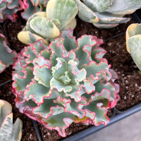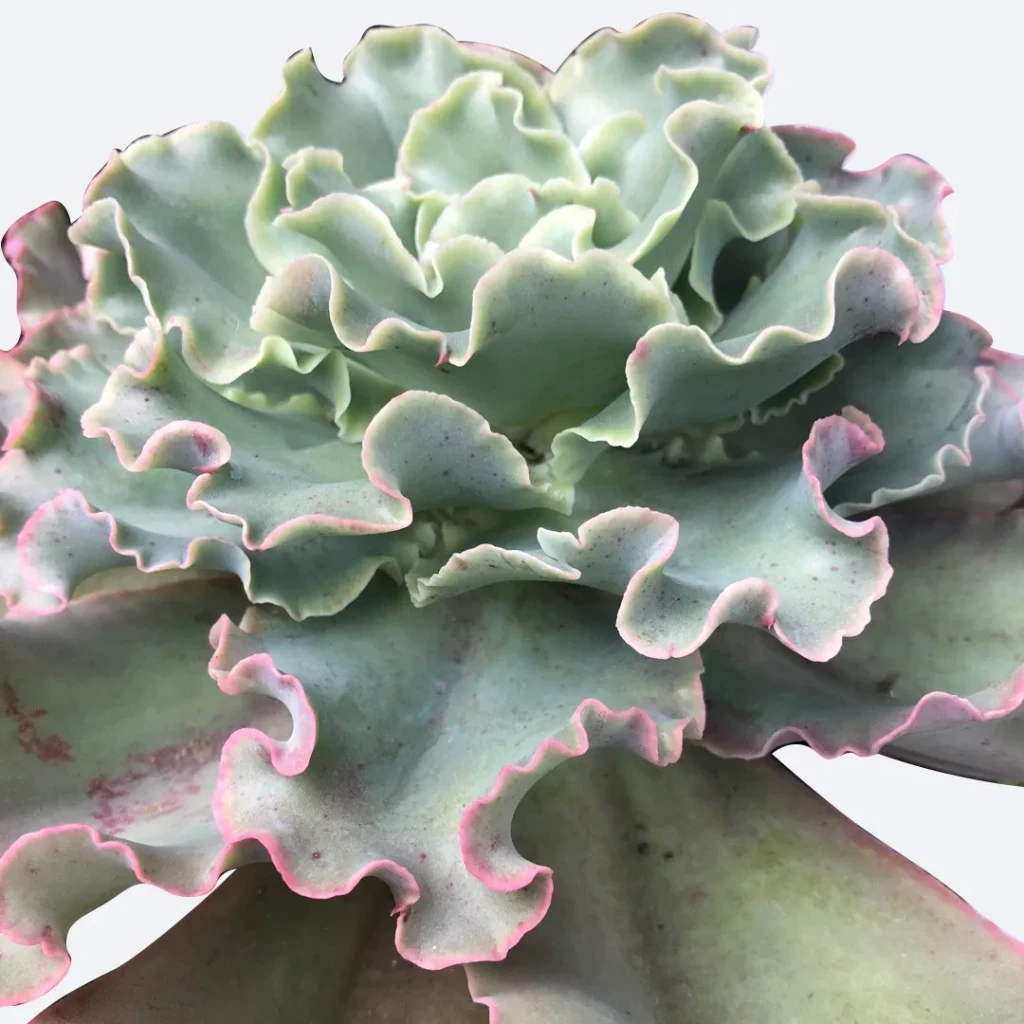 Echeveria ‘Aquarius’, Crassulaceae familyasına ait, dalgalı yaprak kenarları ve geniş rozet yapısıyla ayırt edilen bir hibrittir. Melezlendiği Echeveria türleri bilinmemektedir. Klasik düz kenarlı Echeveria formlarından farklı olarak belirgin kıvrımlı ve fırfırlı yaprak yapısına sahiptir. Genç dönemde kompakt bir merkez oluşturur; olgunlaştıkça rozet çapı genişler ve katmanlı, hacimli bir görünüm kazanır. Bitki genellikle kısa gövdeli gelişir, ancak yaş ilerledikçe alt yaprakların kurumasıyla gövde hafifçe açığa çıkabilir. Echeveria ‘Aquarius’ yaprakları kalın, etli ve su depolama kapasitesi yüksek yapıdadır. Yaprak formu geniş tabanlı, uç kısma doğru hafif incelen ve kenarları belirgin şekilde dalgalıdır. Bu dalgalı yapı, rozet merkezinde daha yoğun ve sık görünür. Yaprak yüzeyi çoğunlukla açık mavi-yeşil ya da gri-yeşil tonlardadır. Yeterli ışık koşullarında yaprak kenarlarında ince pembe veya lila tonlu çerçeve oluşabilir. Bu kenar pigmentasyonu ışık yoğunluğuna bağlı olarak belirginleşir. Düşük ışık koşullarında renk kontrastı azalır ve bitki daha düz yeşilimsi bir tona dönebilir. Yaprak yüzeyinde hafif mumsu bir tabaka bulunabilir; bu tabaka su kaybını azaltmaya yardımcı olur.