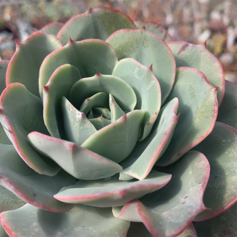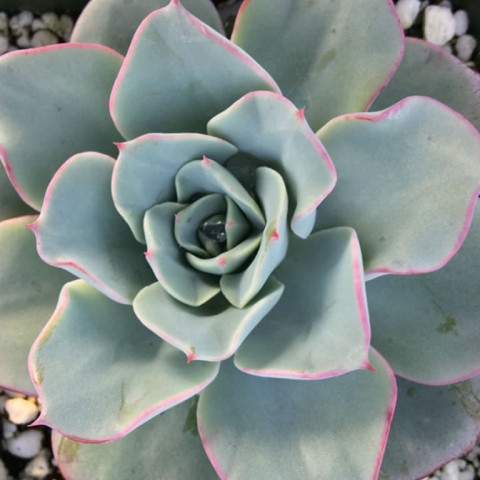 Echeveria ‘Atlantis’, düzenli ve kompakt rozet yapısı ile tanınan, mavi-yeşil zemin rengi ve belirgin pembe kenar hattı olan bir türdür. Melezlendiği Echeveria türleri bilinmemektedir. Rozet simetrik ve katmanlı bir yapı sergilemektedir. Yapraklar merkezden dışa doğru spiral biçimde dizilmiş olup rozetin formu dengeli ve sıkıdır. Bu kompakt yapı, yeterli ışık koşullarının göstergesi olarak değerlendirilir. Yaprak formu geniş tabanlı ve uca doğru hafif daralan yapıdadır. Uç kısmı belirgin şekilde sivridir ve genellikle küçük, noktasal bir pembe uç pigmentasyonu taşır. Yaprak kenarları boyunca ince ve kesintisiz bir pembe-kırmızı hat gözlenmektedir. Bu kenar çizgisi özellikle yüksek ışık altında daha net hâle gelir. Kenar pigmentasyonu, yaprak yüzeyinden bağımsız olarak çerçeve oluşturacak şekilde ilerler.
