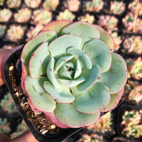 Yaprak yüzeyi mat ve düzgün dokuludur. Farina tabakası hafif düzeydedir; bu nedenle yüzey tamamen pudramsı değil, yarı mat bir görünüm sergiler. Bazı yapraklarda yüzey üzerinde hafif lekelenmeler ya da farina kaybı görülebilir. Bu durum genellikle mekanik temas, su damlası teması ya da çevresel stresle ilişkilidir. Farina yoğunluğu, ışık ve nem koşullarına bağlı olarak değişkenlik gösterebilir. Renk dağılımı homojendir. Ana ton açık mavi-yeşil ya da soluk adaçayı yeşili olarak tanımlanabilir. Merkezdeki genç yapraklar daha açık ve daha canlı görünürken, dış yapraklar hafif daha koyu tonlara geçiş yapabilir. Işık düzeyi arttıkça kenar pigmentasyonu belirginleşir; serin dönemlerde bu pembe ton daha doygun hâle gelebilir. Düşük ışık koşullarında kenar rengi zayıflayabilir ve rozet yapısı gevşeyebilir. Yaprak kalınlığı orta-yüksek seviyededir. Etli yapı su depolama kapasitesini gösterir. Yapraklar düz ve hafif konkav formdadır; içe doğru hafif çanaklanma eğilimi görülebilir. Bu yapı rozetin hacimli ve katmanlı görünümünü destekler. Yaprak yüzeyi genellikle pürüzsüzdür; belirgin kabarıklık ya da dalgalanma gözlenmez.