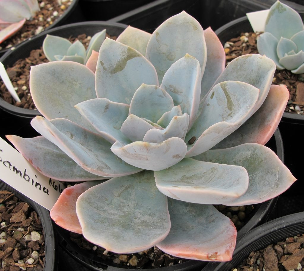 Echeveria ‘Bambino’, Echeveria laui ile belirtilmemiş bir başka Echeveria türünün melezlenmesi sonucu olmuştur. Crassulaceae familyasına ait olan bu bitki, sık yaprak dizilimi ve düzenli rozet formu ile karakterizedir. Gövde genellikle kısa kalır ve yaprak yoğunluğu nedeniyle görünmez. Echeveria ‘Bambino’ yaprakları kalın, etli ve su depolama kapasitesi yüksek yapıdadır. Yaprak formu çoğunlukla elips şeklindedir; uç kısımlar hafif sivrilebilir. Yaprak yüzeyi pürüzsüzdür ve bazı bireylerde ince bir farina tabakası bulunabilir. Bu tabaka yapraklara mat bir görünüm kazandırır ve ışığa karşı koruyucu işlev görür. Renklenme ışık miktarına bağlı olarak değişiklik gösterebilir. Yüksek aydınlık altında mavi-yeşil tonlara pembe veya kırmızımsı kenar hatları eşlik edebilir. Daha düşük ışıkta renkler açık yeşil veya gri-yeşil aralığında kalabilir. Yetersiz ışık koşullarında rozet gevşeyebilir ve yaprak araları açılabilir. Bu tür yüksek aydınlık gereksinimine sahiptir. Doğrudan sabah güneşi kompakt formun korunmasına katkı sağlar. Uzun süreli düşük ışık, minyatür rozet yapısının bozulmasına neden olabilir. İç mekânda yetiştirilecekse gün ışığını en fazla alan pencere önü tercih edilmelidir. Dış mekânda bakımı mümkündür; ancak ani ve yoğun öğle güneşine maruz bırakılmadan önce kademeli adaptasyon uygulanmalıdır. Işık düzeyi arttıkça yaprak kenar renkleri daha belirgin hale gelir.