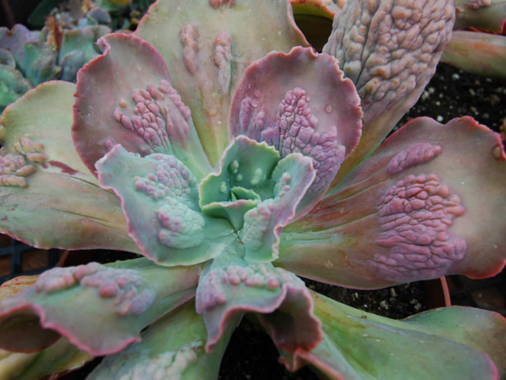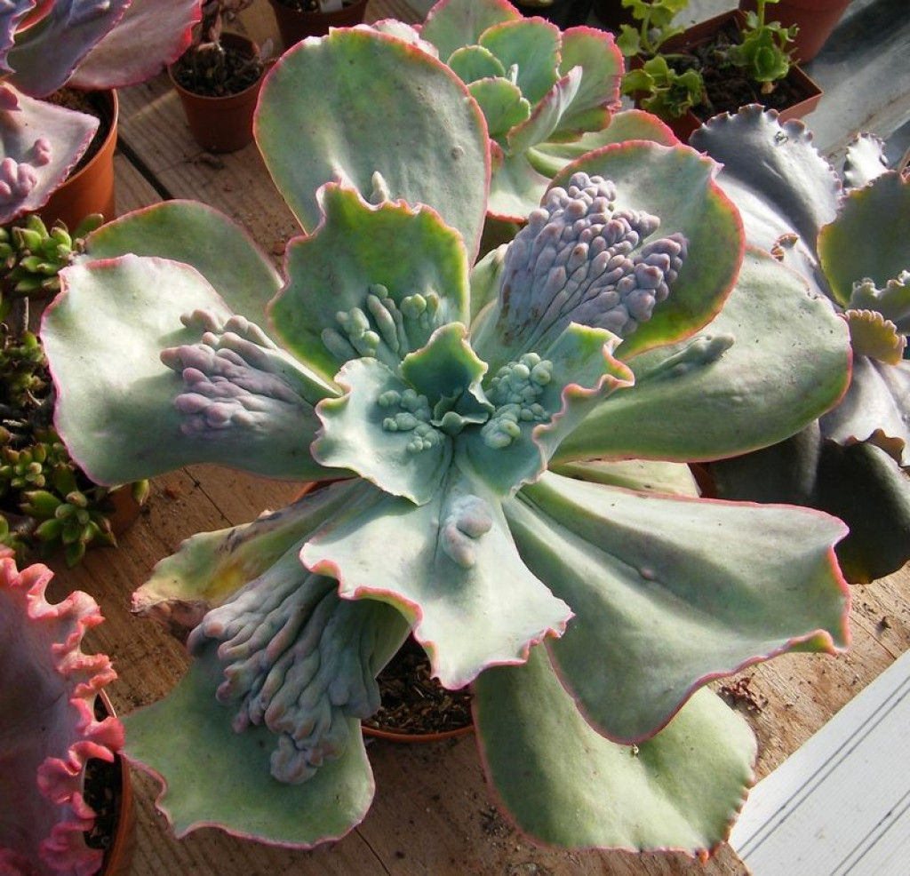 Echeveria ‘Barbillion’, sıra dışı yaprak dokusuyla koleksiyonlarda hemen fark edilen, nadir bir türdür. Echeveria 'Barbillion' popüler bir Dick Wright melezidir; "Volkan Serisi"ndeki Echeveria 'Mauna Loa' ve Echeveria 'Etna'yı da içeren üç Echeveria'dan biridir. Bu türün en ayırt edici özelliği, yaprak yüzeyinde oluşan kabarcıklı ve siğilimsi çıkıntılardır. Yapraklar kalın, geniş ve rozet formunda dizilir; ancak yüzey pürüzsüz değildir. Pembemsi-mor tonlarda kabaran dokular, açık yeşil zemin üzerinde belirgin şekilde kontrast oluşturur. Uygun ışık koşullarında hem kabartılar hem de yaprak kenarları daha yoğun pembe-kırmızı tonlar alabilir. Rozet çapı genellikle 12–18 cm aralığında gelişir. Yapraklar geniş ve hafif dalgalı kenarlara sahip olabilir. Merkezdeki genç yapraklar daha düzgün başlar, zamanla kabartılı yapı belirginleşir. Bu anormal gibi görünen doku aslında genetik bir varyasyondur; hastalık belirtisi değildir. Ancak doku nedeniyle su damlaları yaprak üzerinde daha görünür kalabilir, bu yüzden sulama sırasında rozet içine su kaçırmamaya dikkat edilmelidir.