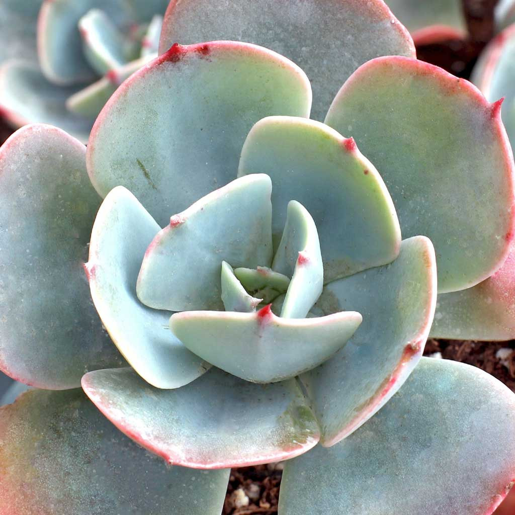 Echeveria ‘Blue Sky’, adından da anlaşılacağı gibi açık gök mavisi ile gri-yeşil arasında değişen yumuşak tonlara sahip, zarif ve dengeli rozet formuyla öne çıkan bir Echeveria 'Imbricata' hibrittidir. Yaprakları geniş, etli ve hafif kaşık formundadır. Merkezden dışa doğru düzenli bir spiral oluşturur ve sağlıklı bir bitkide rozet oldukça simetrik görünür. Yaprak yüzeyinde ince bir pudramsı kaplama bulunur; bu tabaka bitkinin doğal koruma mekanizmasının bir parçasıdır ve güneş ışığını filtreleyerek su kaybını azaltmaya yardımcı olur. En belirgin özelliği, yaprak kenarlarında oluşan pembe tonlu çerçevedir. Yeterli ışık ve serin gece sıcaklıkları altında bu pembe renk daha canlı ve belirgin hale gelir. Düşük ışık koşullarında ise hem mavi tonlar hem de kenar renklenmesi soluklaşır. Rozet çapı genellikle 12–18 cm aralığında gelişir. Yapraklar sıkı ve yukarı doğru hafif kavisli durur; ışık yetersizliğinde rozet açılır ve yaprak araları belirgin şekilde genişler.