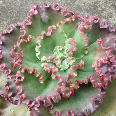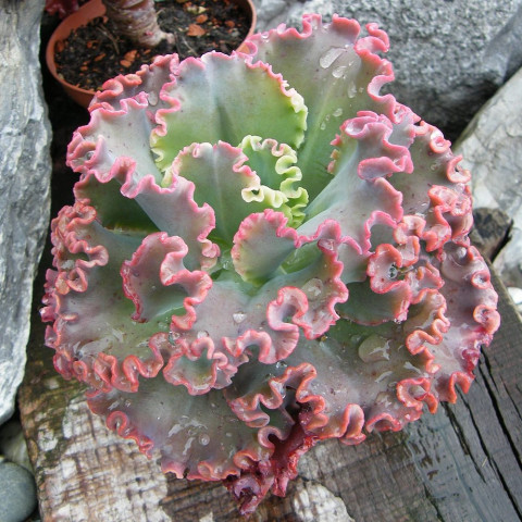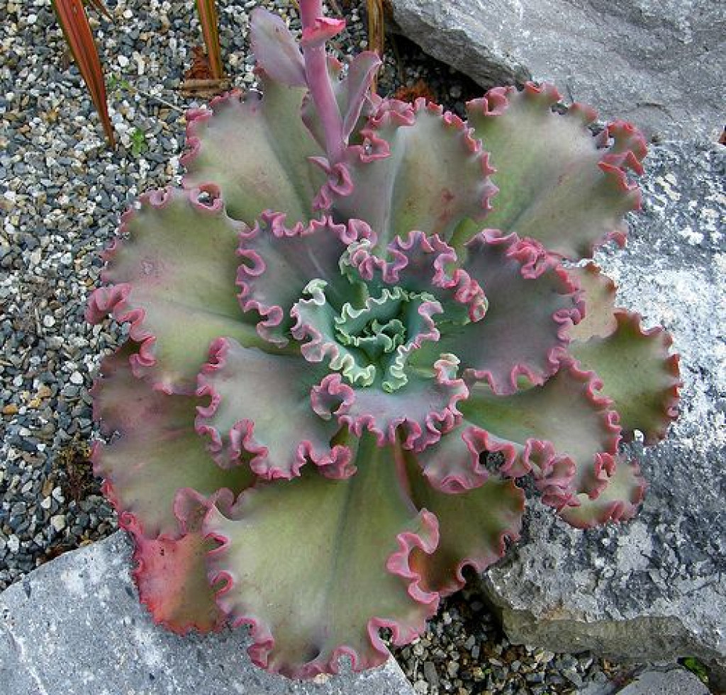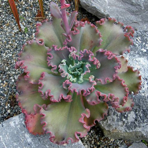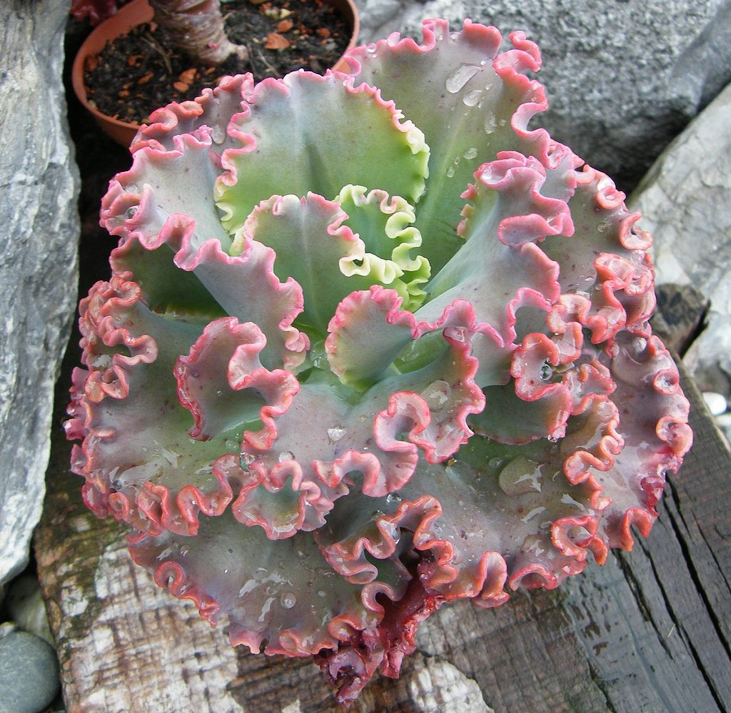 Echeveria ‘Can Can’, Crassulaceae familyasına bağlı Echeveria cinsi içinde yer alan, özellikle kıvrımlı ve dalgalı yaprak kenarları ile tanınan gösterişli bir kültivardır. Rozet formu belirgindir ancak klasik düz kenarlı Echeveria formlarından farklı olarak yaprak kenarlarında belirgin fırfırlı bir yapı bulunur. Bu kenar yapısı bitkiye hacimli ve hareketli bir görünüm kazandırır. Kompakt gelişim gösterebilmekle birlikte, uygun koşullarda rozet çapı genişleyebilir. Yapraklar kalın, etli ve su depolama kapasitesi yüksek dokudadır. Form olarak geniş spatulaya benzer bir yapı sergiler; tabanda genişleyip uca doğru hafif daralır. En ayırt edici özellik, yaprak kenarlarının düzensiz ve kıvrımlı olmasıdır. Bu kıvrımlar özellikle olgun yapraklarda daha belirgindir. Yaprak yüzeyi çoğunlukla mat ve pudramsı bir tabaka ile kaplıdır. Bu mumsu örtü, su kaybını azaltmaya yardımcı olur ve güneş ışığını yansıtarak doku koruması sağlar.
