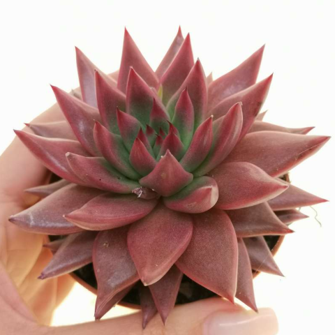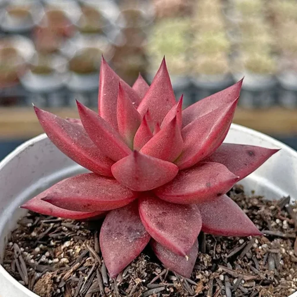 Echeveria ‘Celestia’, yoğun renklenmesi ve sivri uçlu yaprak dizilimiyle öne çıkan bir Echeveria agavoides türüdür. Rozet formu düzenli, kompakt ve simetriktir. Yapraklar merkezden dışa doğru katmanlı biçimde yerleşir ve bitki olgunlaştıkça çapı belirgin şekilde artar. Genç dönemde gövde görünmez; zamanla alt yaprakların kuruyup dökülmesiyle kısa ve kalın bir gövde oluşabilir. Sağlıklı koşullarda rozet sıkı kalır ve yaprak araları açılmaz. Yapraklar kalın, üçgenimsi ve sivri uçludur. Etli yapı su depolama kapasitesinin yüksek olduğunu gösterir. Türün en dikkat çekici özelliği, uygun ışık altında ortaya çıkan yoğun kırmızı, bordo veya koyu pembe tonlarıdır. Ana renk genç yapraklarda daha açık tonlarda olabilirken, güçlü ışık ve serin gece sıcaklıklarıyla birlikte tüm rozet homojen kırmızıya dönebilir. Düşük ışıkta ise renk açılır ve bitki daha yeşilimsi tonlara kayabilir. Yaprak yüzeyi genellikle hafif mattır ve bazı örneklerde ince bir pudramsı tabaka görülebilir. Sürekli nemli ortamda yaprak dokusu gevşeyebilir ve çürüme riski artar.