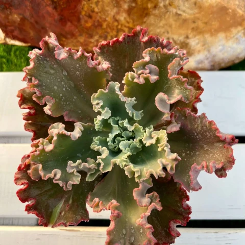 Sulama uygulamasında toprak tamamen kuruduktan sonra sulama yapılmalıdır. Yüzey kuruluğu yeterli değildir; alt katmanların da kuruması gerekir. Dalgalı yaprak yapısı nedeniyle rozet merkezinde ve kıvrım aralarında su birikmemesine dikkat edilmelidir. Serin dönemlerde sulama aralığı uzatılmalıdır. Çiçeklenme döneminde rozet merkezinden uzun bir çiçek sapı yükselir. Sap üzerinde çan formunda küçük çiçekler oluşur. Çiçek rengi kırmızı tonlarındadır. Çiçeklenme ışık ve genel bakım koşullarına bağlı olarak değişkenlik gösterebilir. Solan saplar steril bir kesici ile uzaklaştırılabilir.