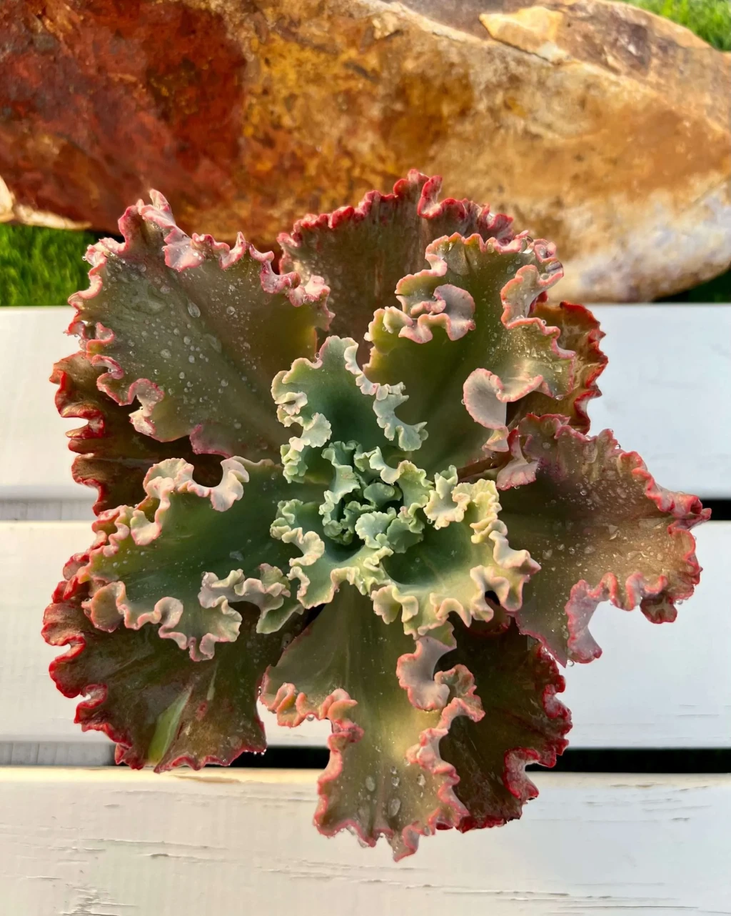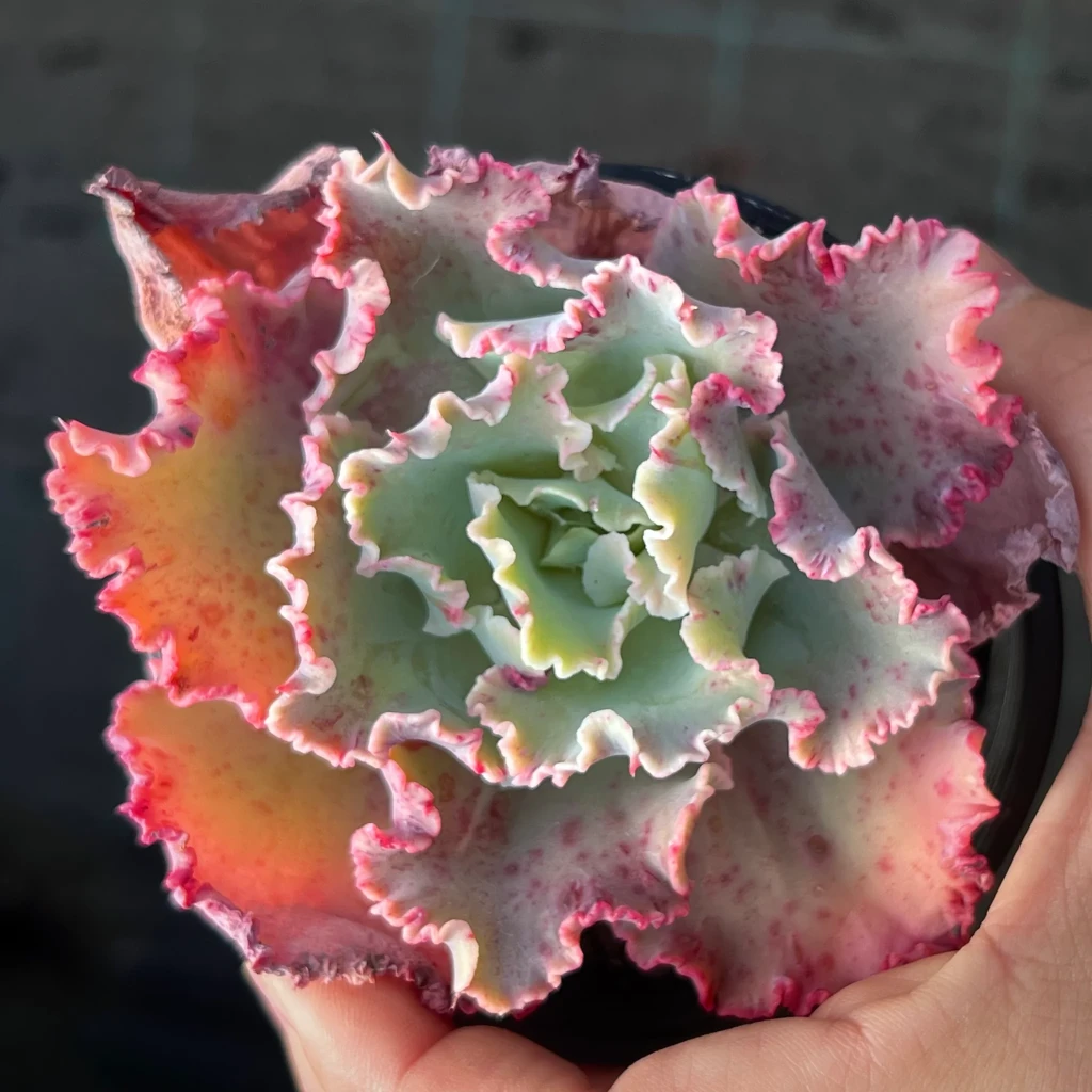 Echeveria ‘Chantilly’, geniş ve yoğun kıvrımlı yaprak kenarlarıyla tanınan, iri rozet formuna sahip gösterişli bir Echeveria kültivarıdır. Bitki gençken kompakt bir rozet oluşturur; olgunlaştıkça çapı belirgin şekilde genişler ve dalgalı yaprak yapısı daha dramatik hale gelir. Gövde genellikle kısa kalır ancak alt yaprakların zamanla kuruyup uzaklaşmasıyla hafif yükselmiş bir yapı oluşabilir. Uygun koşullarda dipten yavru verebilir fakat çoğunlukla tek büyük rozet formu baskındır. Yapraklar geniş, kalın ve etlidir. En belirgin özellikleri kenarlarının yoğun şekilde dalgalı ve fırfırlı olmasıdır. Bu kıvrımlar düzensiz ve hacimli bir görünüm oluşturur. Yaprak yüzeyi düz veya hafif içbükey olabilir. Ana renk açık yeşil ile gri-yeşil tonları arasında değişir. Güçlü ışık ve serin koşullarda yaprak kenarlarında pembe, mercan veya kırmızı tonlar belirginleşir. Kenar çizgisi genellikle daha koyu renkte ve ince bir hat şeklindedir.
