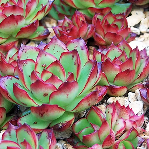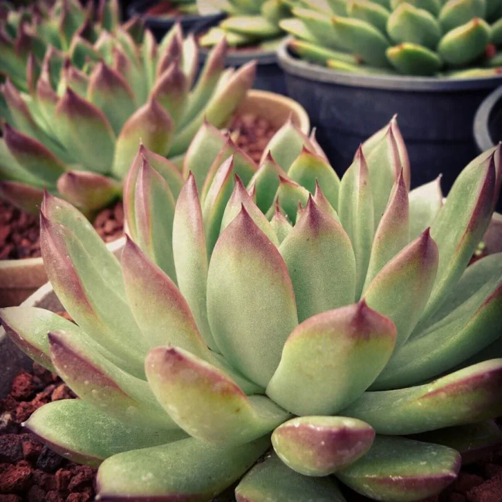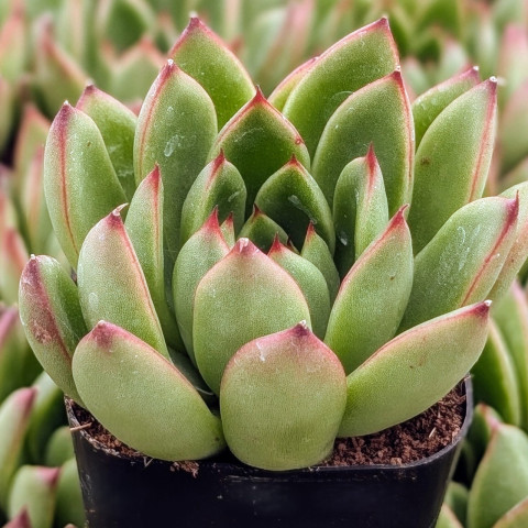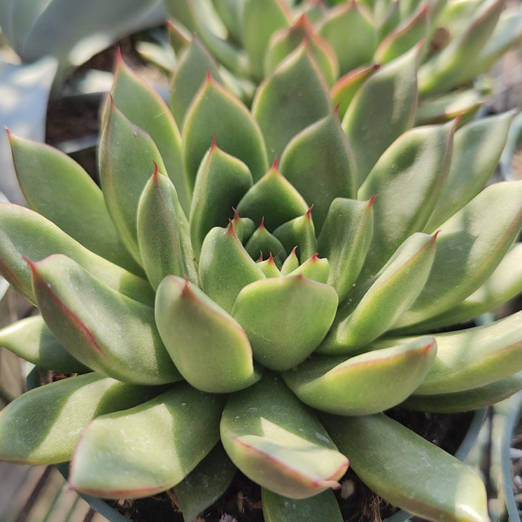 Echeveria ‘Christmas’, adını yapraklarındaki canlı kırmızı ve yeşil kontrasttan alan, kompakt gelişimli ve yoğun renk potansiyeline sahip bir türdür. Echeveria agavoides türünün kültivarıdır. Bu çeşit, simetrik ve sıkı rozet formuyla dikkat çeker. Sağlıklı gelişim gösteren bireylerde yapraklar merkezden dışa doğru spiral dizilimle yerleşir ve rozet yapısı belirgin şekilde katmanlı görünür. Uygun koşullarda zamanla dipten yavrular oluşturarak kümelenme eğilimi gösterebilir ve bu da bitkiye daha dolgun bir görünüm kazandırır. Yapraklar kalın, etli ve üçgene yakın formdadır. Uç kısımları belirgin şekilde sivridir. Temel yaprak rengi açık ile orta ton arasında değişen canlı bir yeşildir. Yaprak kenarları ve uçları ise yoğun kırmızı ya da bordo tonlara döner. Bu kırmızı pigmentasyon, özellikle yüksek ışık ve sıcaklık farkı bulunan dönemlerde daha belirgin hale gelir. Serin geceler ve güçlü aydınlık, kenar renklenmesini artırabilir. Işık yetersiz olduğunda kırmızı tonlar zayıflar ve bitki daha homojen yeşil görünüm alır. Yaprak yüzeyi genellikle hafif parlak ya da ince pudramsı yapıdadır; bu tabaka su kaybını azaltmaya yardımcı olur.