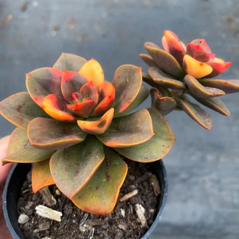 Echeveria ‘Chroma’, Crassulaceae familyasına ait, yoğun renk geçişleri ve kontrastlı yaprak tonlarıyla öne çıkan hibrit bir kültivardır. Melezlendiği türler bilinmemektdir. Kompakt rozet yapısı, katmanlı ve dengeli dizilim gösteren yaprakları sayesinde simetrik bir görünüm oluşturur. Bitki genç dönemde tek rozet halinde gelişir; uygun koşullarda zamanla yan sürgünler vererek dallanabilir. Gövde genellikle kısa kalır ve yapraklar merkezden dışa doğru spiral biçimde sıralanır. Echeveria ‘Chroma’ yaprakları kalın, etli ve su depolama kapasitesi yüksek dokudadır. Yaprak formu geniş tabanlı, uç kısmı hafif sivri ve kenarları belirgin hatlıdır. Bu kültivarın en dikkat çekici özelliği renk değişkenliğidir. Yaprak merkezinde yeşil tonlar hâkimken, dış katmanlarda kırmızı, bakır, bordo ve turuncu geçişler görülebilir. Işık yoğunluğu arttıkça kırmızı ve turuncu pigmentasyon belirginleşir. Daha düşük ışık koşullarında ise tonlar koyu yeşil ve kahverengimsi renklere dönebilir. Yaprak yüzeyi mat ve hafif mumsu olabilir; bu doğal kaplama su kaybını azaltmaya yardımcı olur.