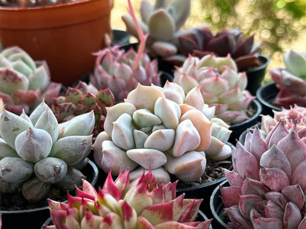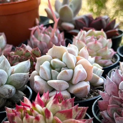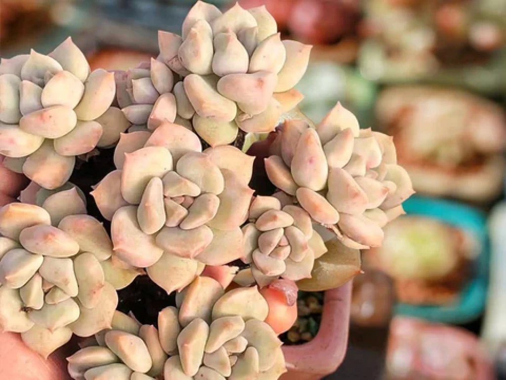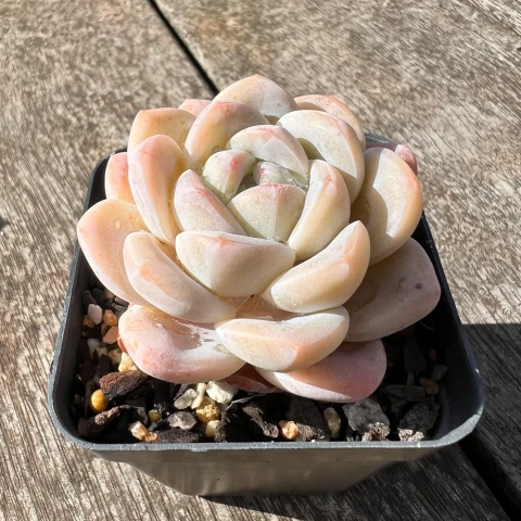 Echeveria ‘Cream Puff’, Crassulaceae familyasına ait, kompakt rozet yapısı ve pastel ton geçişleriyle öne çıkan bir sukulent kültivarıdır. Bu bitkiyi oluşturan Echeveria türleri bilinmemektedir. Bitki kısa gövdeli gelişim gösterir ve yapraklar gövdeyi büyük ölçüde örter. Uygun yetiştirme koşullarında yan sürgünler oluşturarak kümelenme eğilimi gösterebilir. Bu özellik, saksı içinde dolgun ve yoğun bir form elde edilmesini sağlar. Zamanla alt yaprakların doğal dökülmesiyle gövde kısmı hafifçe belirginleşebilir. Echeveria ‘Cream Puff’ yaprakları kalın, etli ve su depolama kapasitesi yüksek yapıdadır. Yaprak formu geniş üçgensi ile kaşık formu arasında değişir; uç kısmı yuvarlak veya hafif sivri olabilir. Yüzey genellikle yoğun bir farina tabakası ile kaplıdır. Farina, bitkinin doğal koruyucu mumsu örtüsüdür ve yapraklara mat, pudramsı bir görünüm kazandırır. Bu tabaka, su kaybını azaltmaya ve güneş ışığına karşı koruma sağlamaya yardımcı olur. Renk dağılımı açık gri-yeşil ile krem tonları arasında değişebilir. Yeterli ışık altında yaprak uçlarında şeftalimsi veya pembe tonlar belirginleşebilir. Işık eksikliğinde rozet formu gevşeyebilir ve renk kontrastı azalabilir.