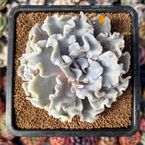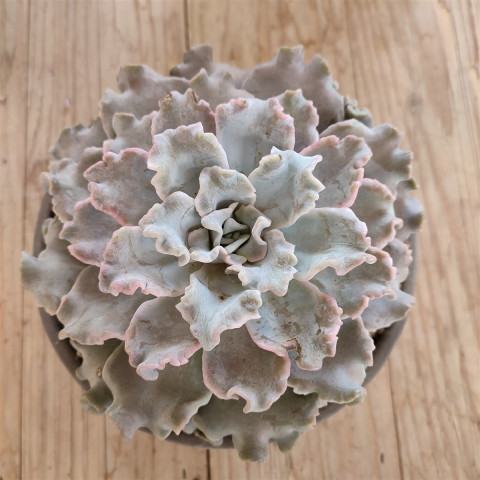 Echeveria ‘Crispate Beauty’, Crassulaceae familyasına ait, dalgalı ve kıvrımlı yaprak kenarlarıyla ayırt edilen bir sukulenttir. Echeveria 'Crispate Beauty', Echeveria lilacina'nın bir mutasyonudur. Rozet formu belirgindir ve yapraklar kısa gövde üzerinde merkezden dışa doğru katmanlı biçimde dizilir. Yaprak kenarlarının kıvrımlı yapısı bitkiye hacimli ve hareketli bir görünüm kazandırır. Gelişim formu çevresel koşullara bağlı olarak değişebilir; yeterli ışık altında rozet daha sıkı ve belirgin kalır. Etli yaprak dokusu su depolama kapasitesi sağlar ve kuraklık toleransı sunar; buna karşılık kök bölgesinde uzun süreli nem birikimi çürüme riskini artırır. Echeveria ‘Crispate Beauty’ yaprakları kalın, geniş ve kenarları belirgin şekilde ondüle (dalgalı) yapıdadır. Yaprak yüzeyi pürüzsüzdür ve ince bir mumsu kaplama ile örtülü olabilir. Bu kaplama, su kaybını azaltarak yaprakların dayanıklılığını destekler. Renklenme ışık düzeyine bağlı olarak değişir. Yüksek aydınlıkta açık yeşil zemin üzerine pembe, şeftali ya da hafif kırmızımsı tonlar gelişebilir. Kenar kıvrımlarında pigment yoğunluğu daha belirgin olabilir. Düşük ışık koşullarında renkler daha yeşil kalabilir ve rozet yapısı gevşeyebilir. Sürekli nemli ortamda alt yapraklarda yumuşama ve doku bozulması görülebilir.
