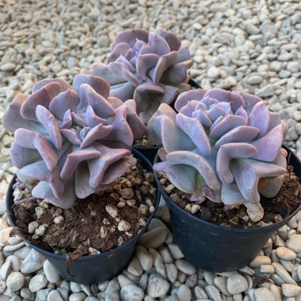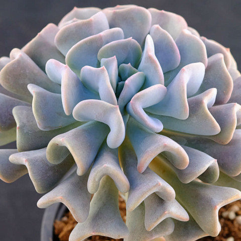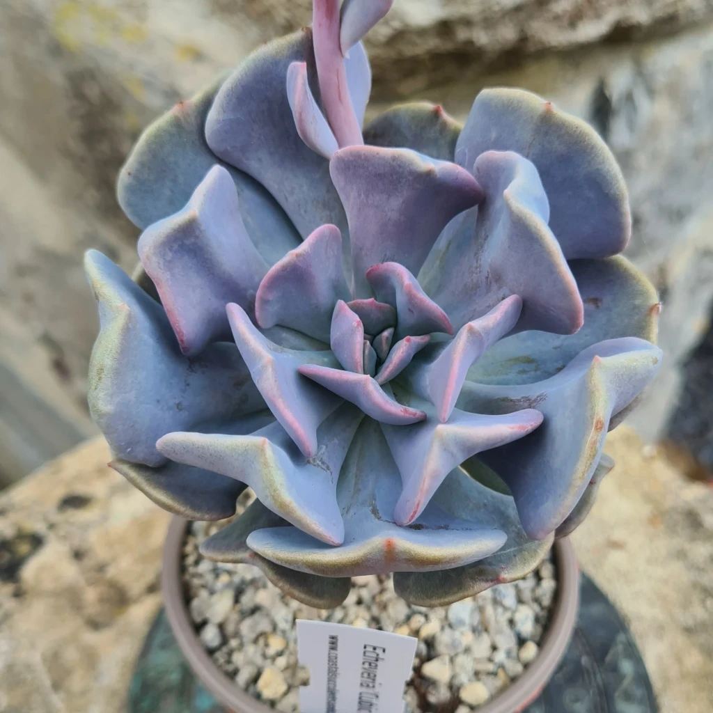 Echeveria ‘Cubic Frost’, Crassulaceae familyasına ait, yoğun kıvrımlı yaprak yapısı ve lila-mor tonlu rengiyle öne çıkan bir sukulenttir. Genişleyen rozet formu ve dalgalı kenar yapısı sayesinde hacimli ve katmanlı bir görünüm oluşturur. Kısa gövde üzerinde merkezden dışa doğru sık biçimde dizilen etli yapraklar, bitkiye kompakt fakat gösterişli bir yapı kazandırır. Yaprak dokusunun su depolama kapasitesi yüksektir; bu durum kuraklık toleransı sağlar. Ancak kök bölgesinde uzun süreli nem birikimi çürüme riskini artırır ve özellikle alt yapraklarda doku bozulmasına neden olabilir. Echeveria ‘Cubic Frost’ yaprakları kalın, etli ve belirgin biçimde ondüle yani kıvrımlı kenarlara sahiptir. Yaprak yüzeyi genellikle yoğun bir mumsu tabaka ile kaplıdır. Bu kaplama, bitkiye mat ve pastel bir görünüm kazandırırken su kaybını azaltmaya yardımcı olur. Renk karakteri bu kültivarın ayırt edici özelliğidir. Yeterli aydınlıkta lavanta, açık mor ve pudra tonları belirginleşir. Kenar kıvrımlarında renk yoğunluğu artabilir. Düşük ışık koşullarında mor pigmentler soluklaşabilir ve yaprak rengi daha yeşilimsi bir tona kayabilir. Sürekli nemli ortamda kıvrımlı yaprak kenarlarında yumuşama ve çürüme riski artar.