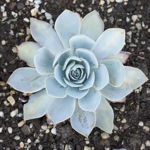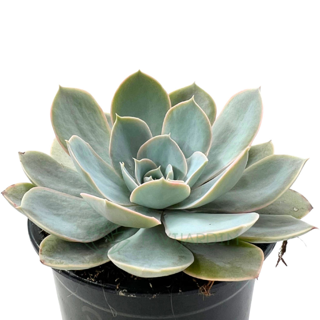 Echeveria ‘Domingo’, düzenli ve simetrik rozet formu ile dikkat çeken, açık mavi ile grimsi tonlar arasında değişen yaprak rengine sahip zarif bir hibrittir. Yaprak yüzeyinde belirgin bir pudramsı kaplama bulunur; bu doğal tabaka bitkinin hem güneş ışığını dengelemesine hem de su kaybını azaltmasına yardımcı olur. Yapraklar etli, geniş tabanlı ve uca doğru hafif sivrilen yapıdadır. Genellikle merkezden dışa doğru kusursuz bir spiral oluşturacak şekilde dizilirler. Uygun ışık koşullarında yaprak kenarlarında hafif pembemsi bir çerçeve oluşabilir; bu renk özellikle serin hava ve güçlü aydınlık altında daha belirgin hale gelir. Sağlıklı bir örnekte rozet çapı ortalama 12–18 cm aralığına ulaşabilir ve bitki kompakt görünümünü uzun süre korur. Bu tür bol aydınlık ortamları tercih eder. Gün içinde birkaç saat filtrelenmiş direkt güneş alması, rozet formunun sıkı kalmasını ve yaprak aralarının açılmamasını sağlar. Yetersiz ışıkta bitki merkezden yukarı doğru uzamaya başlar, yapraklar gevşer ve estetik simetri bozulur. İç mekânda yetiştirilecekse ışık alan pencere önü idealdir. Ancak ani ve yoğun güneş geçişleri yaprak yüzeyinde yanıklara neden olabileceğinden kademeli alışma süreci önemlidir. Yaprak üzerindeki farina tabakası, bitkinin doğal koruma mekanizmasıdır; sık dokunma veya yaprak silme bu tabakayı zayıflatabilir.