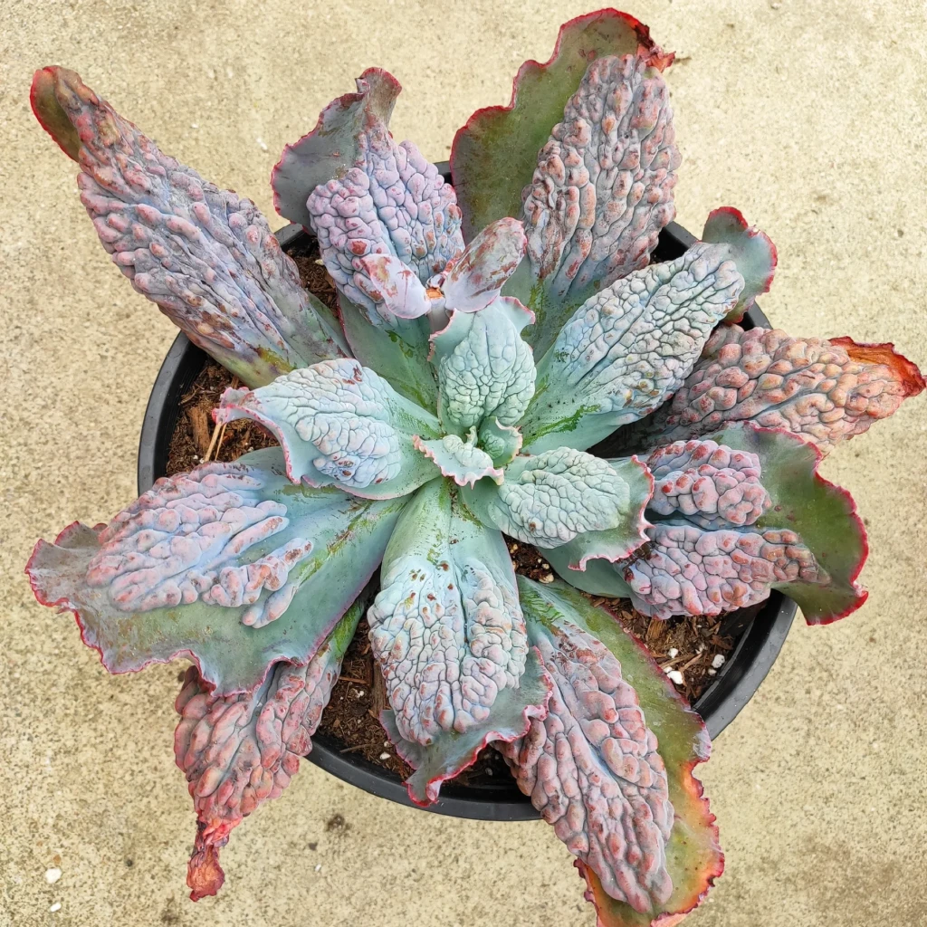 Echeveria ‘Etna’, yüzeyindeki kabarcıklı ve pütürlü yaprak dokusuyla koleksiyonlarda hemen fark edilen sıra dışı bir hibrittir. Echeveria 'Mauna Loa' ve Echeveria 'Barbillion' arasında yapılan bir çaprazlamanın sonucudur. Bu melez, ebeveynleri Echeveria 'Mauna Loa' ve Echeveria 'Barbillion' ile birlikte "Volkan Serisi"ndeki üç Echeveria'dan biridir. Yapraklar geniş, kalın ve dalgalı kenarlıdır; üst yüzeylerinde belirgin kabartılar bulunur. Bu kabartılar genellikle morumsu, pembemsi ya da kırmızı tonlara dönüşebilir ve özellikle güçlü ışık altında daha da belirginleşir. Yaprak kenarlarında ince kırmızı bir çerçeve hattı oluşur. Genel zemin rengi gri-yeşil ile mavi-yeşil arasında değişir. Işık, sıcaklık ve su dengesi bu renk kontrastını doğrudan etkiler. Rozet formu genç bitkilerde sık ve kompaktken, zamanla gövde uzayabilir ve alt yapraklar döküldükçe belirgin bir gövde ortaya çıkabilir. Bu durum türün doğal gelişim sürecidir. Gövde odunsu bir görünüm alabilir ve bitkiye küçük bir sukulent ağaç estetiği kazandırır. Yetersiz ışıkta yapraklar incelir, kabartılar silikleşir ve renk doygunluğu azalır. Aşırı sulama ise kabarcıklı yüzeylerde yumuşama ve çürümeye yol açabilir.