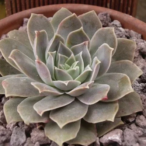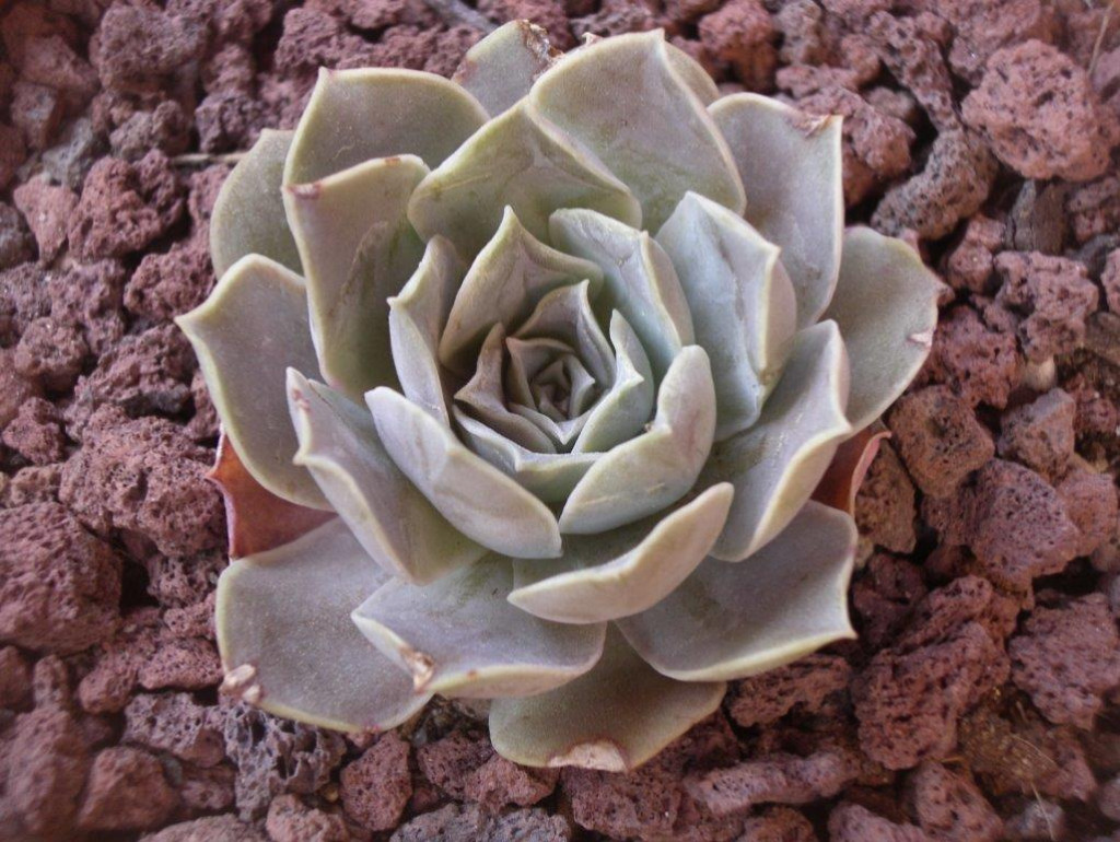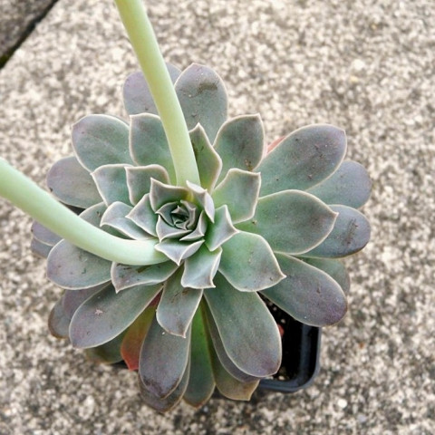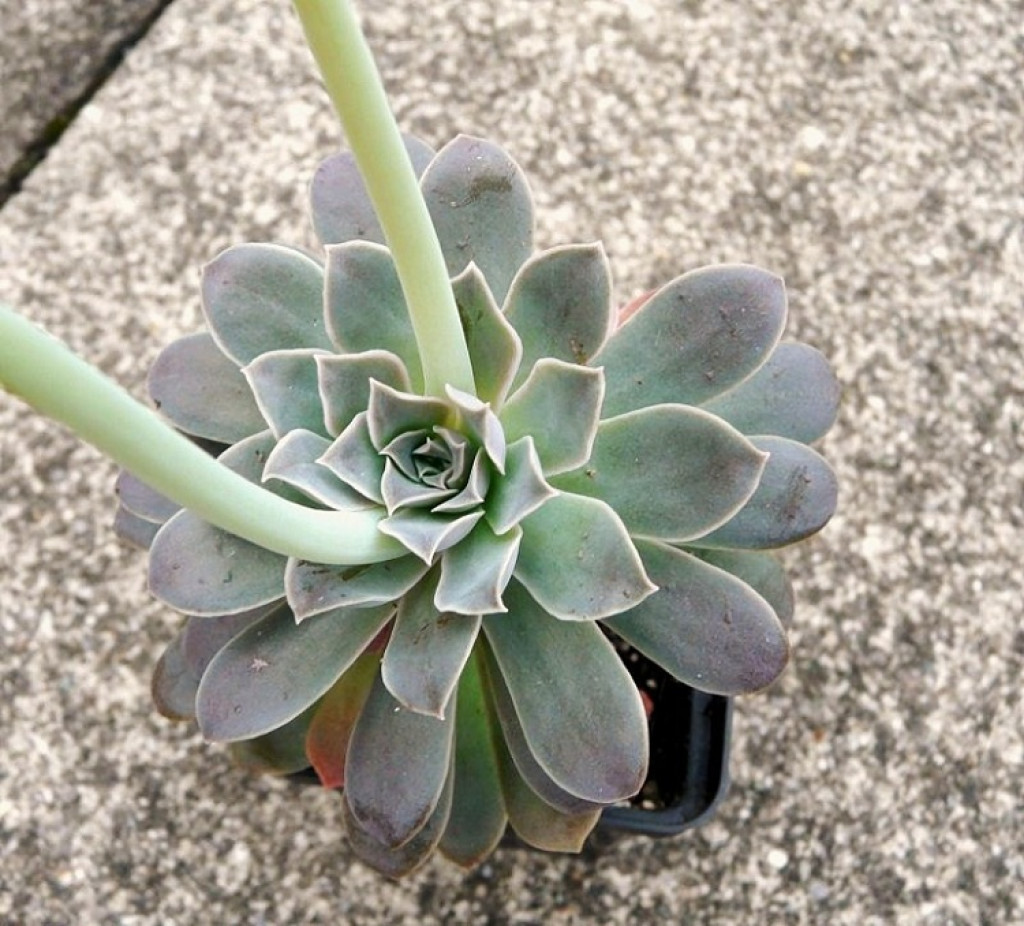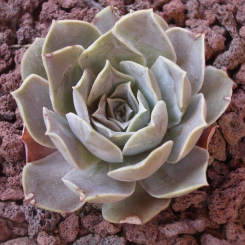 Echeveria eurychlamys, Crassulaceae familyasına ait, kompakt rozet formu ve geniş yaprak yapısıyla bilinen bir sukulent türüdür. Bitki genellikle yere yakın, simetrik ve yoğun dizilimli rozetler oluşturur. Gövde kısa ve kalındır; genç bireylerde görünmez durumdadır. Zamanla alt yaprakların kuruyarak dökülmesiyle kısa bir gövde açığa çıkabilir. Uygun bakım koşullarında rozet sıkı ve dengeli kalır; ışık yetersizliğinde ise yaprak araları açılır ve form gevşer. Yapraklar kalın, etli ve geniş spatula formuna yakındır. Uç kısımları hafif sivri ya da yuvarlağa yakın olabilir. Yaprak yüzeyi genellikle pürüzsüzdür ve çoğu örnekte ince mumsu bir kaplama bulunur. Bu kaplama su kaybını azaltmaya yardımcı olur ve yaprağa mat bir görünüm kazandırır. Renk tonları açık gri-yeşilden mavimsi yeşile kadar değişebilir. Güçlü ışık altında yaprak kenarlarında pembe ya da kırmızımsı bir hat oluşabilir. Bu renklenme, ışık yoğunluğuna bağlı pigment artışından kaynaklanır. Yaprak yüzeyine temas edilmesi mumsu tabakanın zarar görmesine ve kalıcı iz oluşmasına neden olabilir.