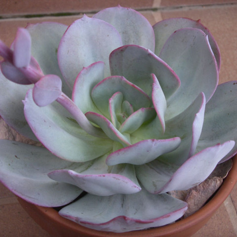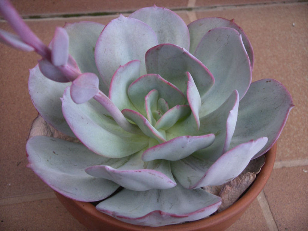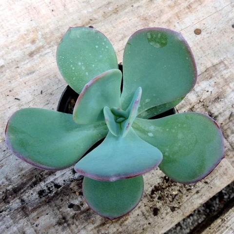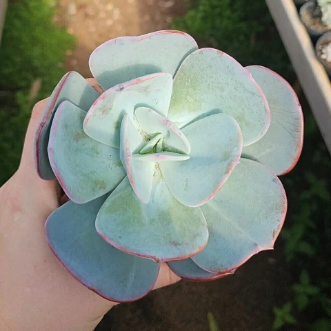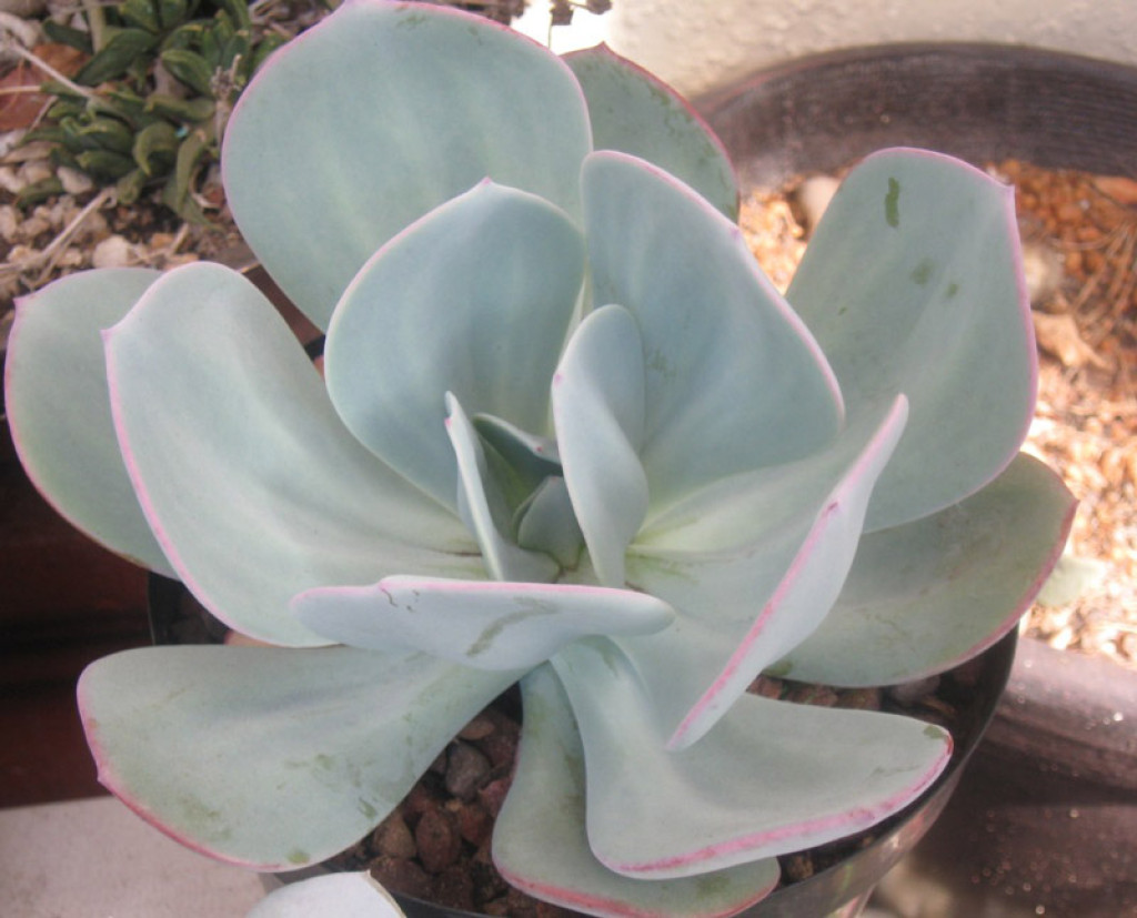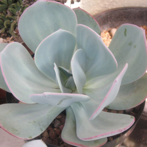 Echeveria ‘Gila’, Crassulaceae familyasına bağlı Echeveria cinsi içerisinde yer alan, geniş ve etli yaprakları ile dikkat çeken bir türdür. Echeveria gigantea ve Echeveria laui türlerinin melezlenmesi sonucu ortaya çıkmıştır. Kompakt rozet formu, pastel mavi-yeşil zemin rengi ve ince pembe kenar hattı bu türün ayırt edici özellikleri arasında yer alır. Bu kültivarda rozet yapısı genellikle geniş ve simetriktir. Yapraklar merkezden dışa doğru spiral dizilim gösterir. Rozet çapının yaşa ve yetiştirme koşullarına bağlı olarak değiştiği görülmektedir. Yaprak formu geniş tabanlı ve uca doğru hafif sivrilen yapıdadır. Uç kısmı belirgin fakat aşırı sivri değildir. Yaprak yüzeyi düz, mat ve hafif pudramsı bir görünüme sahiptir. Bu pudramsı kaplama, doğal farina tabakasından kaynaklanır ve su kaybını azaltmaya yardımcı olur. Yaprak rengi çoğunlukla açık mavi-yeşil veya soluk adaçayı tonundadır. Işık düzeyi arttıkça yaprak kenarlarında pembe ya da kırmızımsı bir çerçeve belirginleşir. Serin dönemlerde bu pigmentasyon daha yoğun hâle gelebilir. Düşük ışık koşullarında kenar rengi zayıflayabilir ve rozet yapısı gevşeyebilir. Yaprak kalınlığı orta-yüksek seviyededir. Etli yapı su depolama kapasitesini gösterir. Yapraklar genellikle hafif içe doğru çanaklanmış formdadır. Bu yapı rozetin hacimli görünmesini sağlar. Dış yapraklar daha yatay konumlanırken merkez yapraklar daha dik açıyla yerleşir. Bu dizilim bitkinin aktif büyüme evresinde olduğunu gösterir.
