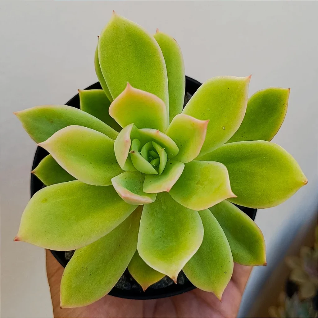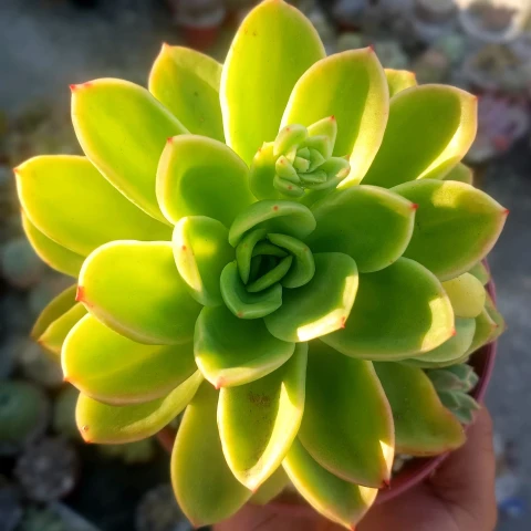 Echeveria ‘Golden Glow’, adını yapraklarında görülen parlak limon-yeşili ve sıcak şeftali tonlarından alan, canlı renk geçişleriyle dikkat çeken bir türdür. Echeveria agavoides türünün bir hibritidir. Bu çeşit, orta boyutlu ve düzenli rozet formu oluşturur. Yapraklar merkezden dışa doğru simetrik spiral dizilim gösterir ve rozet genel olarak dengeli, açık ve ferah bir görünüm sunar. Uygun koşullarda dipten yavru vererek kümelenebilir ve saksı içinde homojen bir kompozisyon oluşturabilir. Yapraklar etli, hafif üçgensi–oval formdadır ve uçları nazikçe sivrilir. Temel renk tonu canlı açık yeşildir; yeterli ışık altında dış yapraklarda altın sarısına çalan bir parlaklık oluşabilir. Serin geceler ve güçlü aydınlık koşullarda yaprak uçlarında ve kenarlarında pembe–somon tonları belirginleşir. Bu renk kontrastı özellikle genç ve sağlıklı rozetlerde daha net gözlemlenir. Işık yetersiz kaldığında bitki daha düz yeşil tona dönebilir ve rozet yapısı gevşeyebilir.