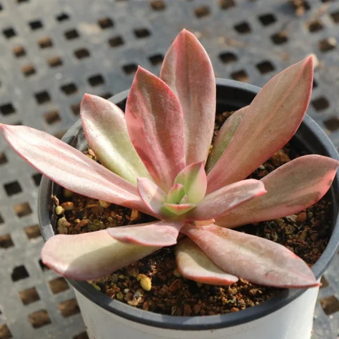Echeveria ‘Hanaikada’, Japon kökenli kültivarlar arasında yer alan, renk geçişleri ve kompakt rozet formu ile öne çıkan zarif bir türdür. Melezlendiği Echeveria türleri bilinmemektedir. “Hanaikada” ismi Japonca’da çiçeklerle kaplı su yüzeyi anlamına gelir ve bu isim bitkinin pastel tonlu, romantik renk paletini oldukça iyi yansıtır. Uygun koşullarda yetiştirildiğinde hem form hem de renk performansı açısından koleksiyon değeri yüksek bir Echeveria’dır. Rozet yapısı genellikle orta boyutlu ve oldukça simetriktir. Yapraklar merkezden dışa doğru sık spiral dizilim gösterir. Kompakt büyüme eğilimi sayesinde rozet merkezi dolu ve dengeli görünür. Işık yetersizliğinde yaprak araları açılabilir; bu nedenle form korunumu doğrudan aydınlatma seviyesi ile ilişkilidir. Yaprak formu geniş, hafif oval ve uç kısmı nazikçe sivridir. Bazı örneklerde uçta minik bir mukron belirgindir. Yaprak yüzeyi mat ve hafif pudramsıdır. Bu farina tabakası bitkinin su kaybını azaltmaya yardımcı olur ve aynı zamanda pastel görünümü güçlendirir. Yapraklara dokunmak bu tabakada kalıcı iz bırakabileceğinden temas minimumda tutulmalıdır.