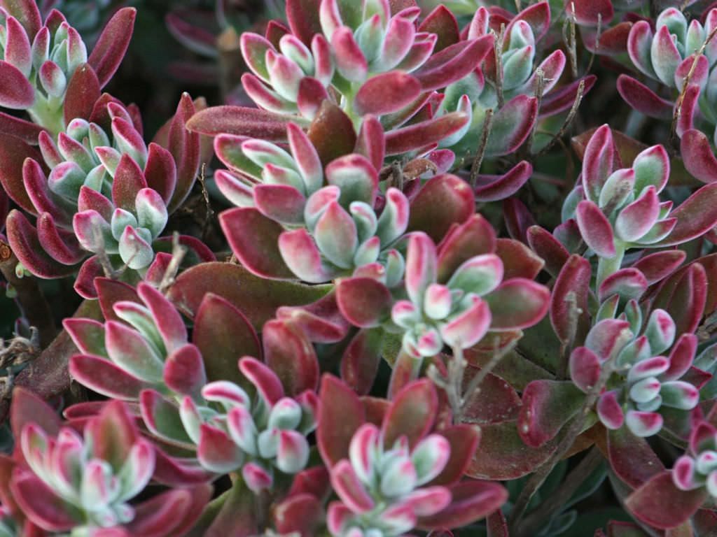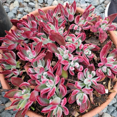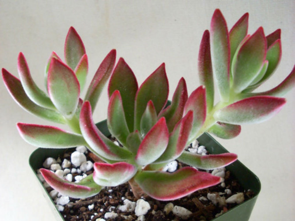 Echeveria harmsii ‘Ruby Slippers’, klasik rozet formundan ziyade küçük, dallanarak yayılan ve yoğun kümeler oluşturan yapısıyla diğer birçok Echeveria’dan belirgin biçimde ayrılır. Echeveria harmsii türünün kültivarıdır. Bu kültivar, düşük boylu fakat sık dallanan gövdelere sahiptir ve zamanla saksı yüzeyini tamamen kaplayacak kadar kompakt bir koloni oluşturabilir. Bitki olgunlaştıkça yatay gelişim gösterir ve çok sayıda minyatür rozet benzeri sürgün üretir. Bu yönüyle hem koleksiyonlarda hem de sığ kaplarda düzenleme bitkisi olarak tercih edilir. Yapraklar küçük, etli ve hafif sivri uçludur. En ayırt edici özelliği yaprak yüzeyindeki ince tüylü dokudur. Bu kadifemsi yapı bitkiye mat ve yumuşak bir görünüm kazandırır. Temel renk gri–yeşil ile açık mint tonları arasındadır; ancak güçlü ışık altında yaprak uçları ve kenarları yoğun kırmızıya döner. Serin hava koşullarında kırmızı pigmentasyon daha da belirginleşir ve bitki neredeyse tamamen yakut tonlarına bürünebilir. Işık yetersiz olduğunda kırmızı tonlar zayıflar ve yapraklar daha yeşil görünür.