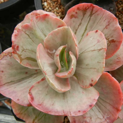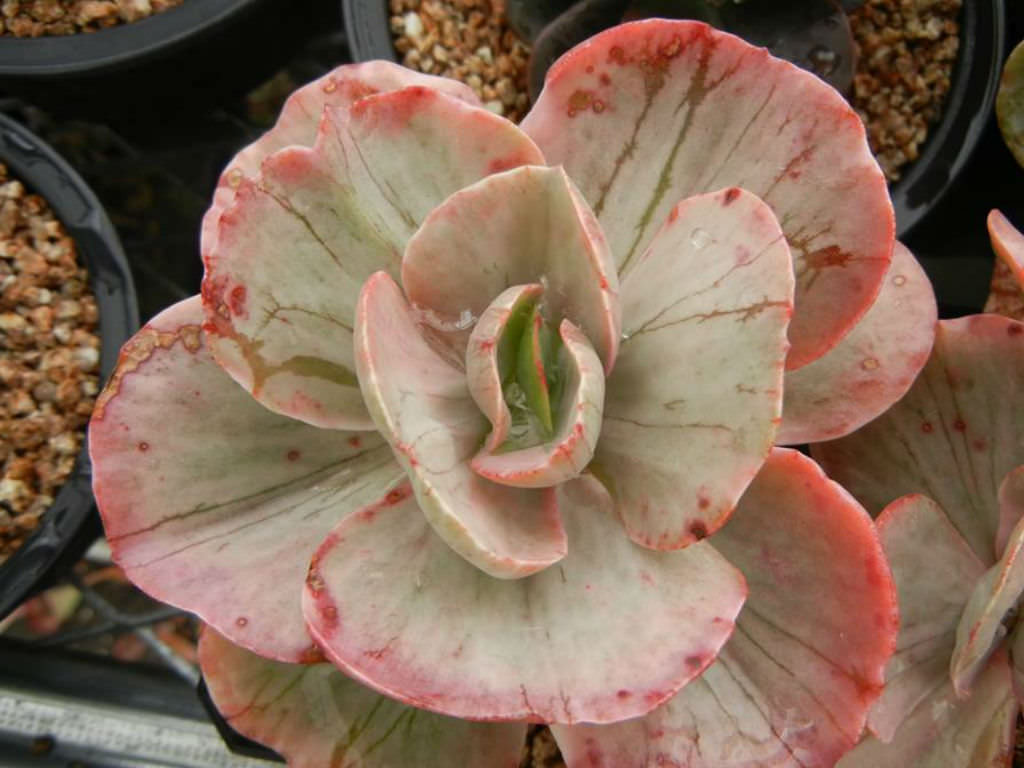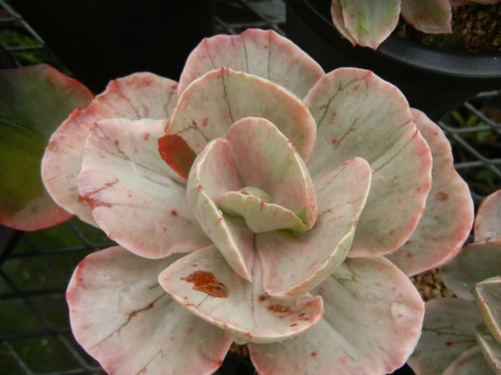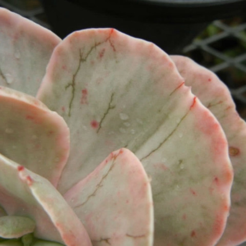 Echeveria ‘Ice Age’, Crassulaceae familyasına ait, geniş ve katmanlı rozet yapısıyla dikkat çeken, açık tonlu yaprakları ve belirgin damar desenleriyle ayırt edilebilen bir türdür. Genç dönemde kompakt bir rozet oluşturur; olgunlaştıkça rozet çapı genişler ve yapraklar daha belirgin katmanlar halinde dizilir. Echeveria ‘Ice Age’ yaprakları kalın, etli ve geniş spatula formuna yakındır. Yaprak yüzeyi genellikle açık gri, soluk mavi-yeşil veya kremimsi tonlar gösterir. Yeterli ışık altında yaprak kenarlarında ve uç kısımlarında pembemsi ya da kırmızımsı çerçeve oluşabilir. Bazı örneklerde yaprak yüzeyinde ince damar benzeri çizgiler belirginleşir. Bu damar görünümü, açık zemin üzerinde daha koyu tonlu hatlar şeklinde gözlemlenebilir ve bitkiye karakteristik bir desen kazandırır. Düşük ışık koşullarında bu renk kontrastı azalabilir ve bitki daha homojen yeşilimsi bir tona dönebilir.